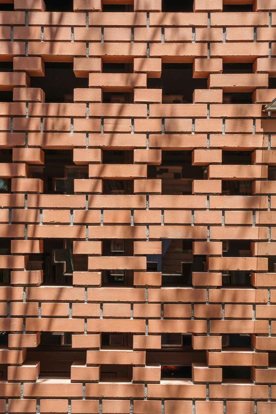 玻璃房将原有山墙面等比例缩小,通过虚空间连接原有建筑与钢构架。加建庭院同样延续原有山墙面的尺寸,使空间连续而富有变化。砖延伸至屋顶以及镂空砖的处理使建筑与周围环境有机融合又富有变化。