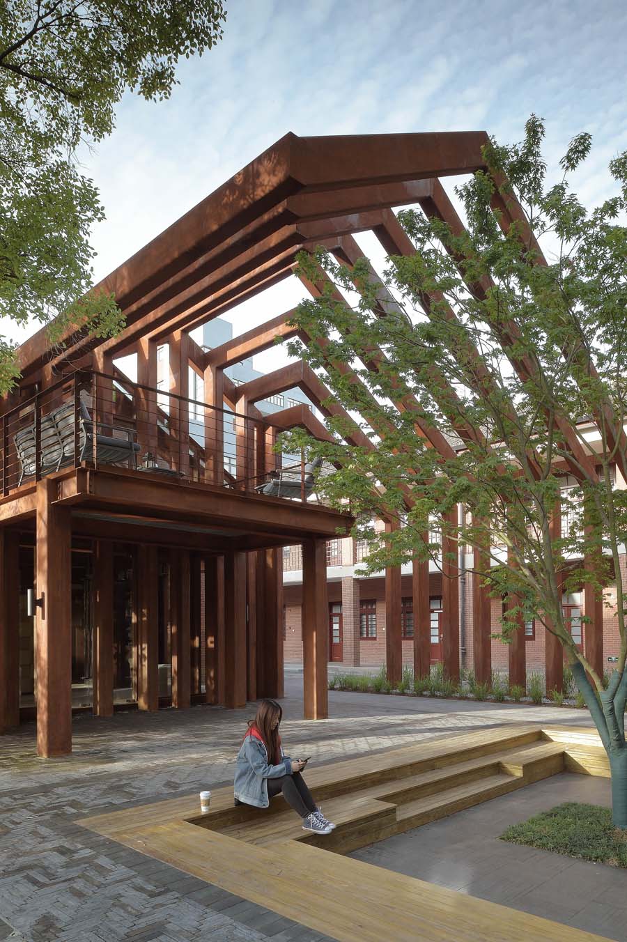 钢结构具有较强的可塑性,入口灰空间通过对坡屋顶元素进行提取,将单体空间转译成面空间,利用锈蚀钢板的折线性处理,营造出入口的提示性空间。