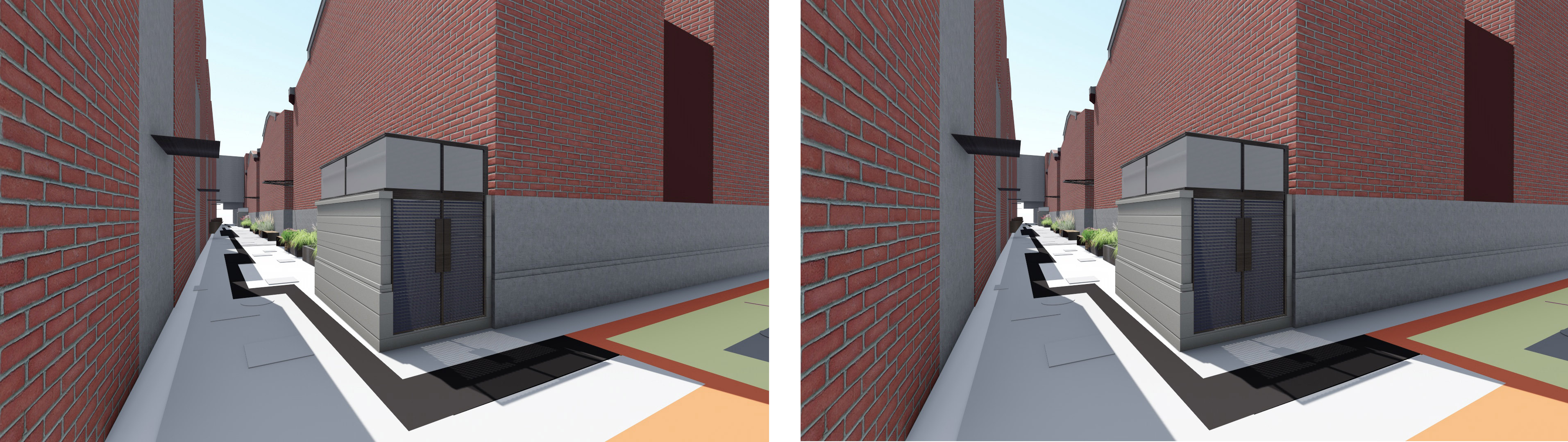 原有警卫亭功能布局不合理,作为入口构筑物形象欠佳。设计师重新调整了警卫亭布局,增设观察窗和快递收发口;面对巷道的立面采用全玻璃面,美化立面的同时利于警卫人员观察小区进出人员;将原有放在屋顶的空调外机整合进警卫亭,使警卫亭成为完整功能的个体,利于在工厂预制并作为标准化做法进行推广。