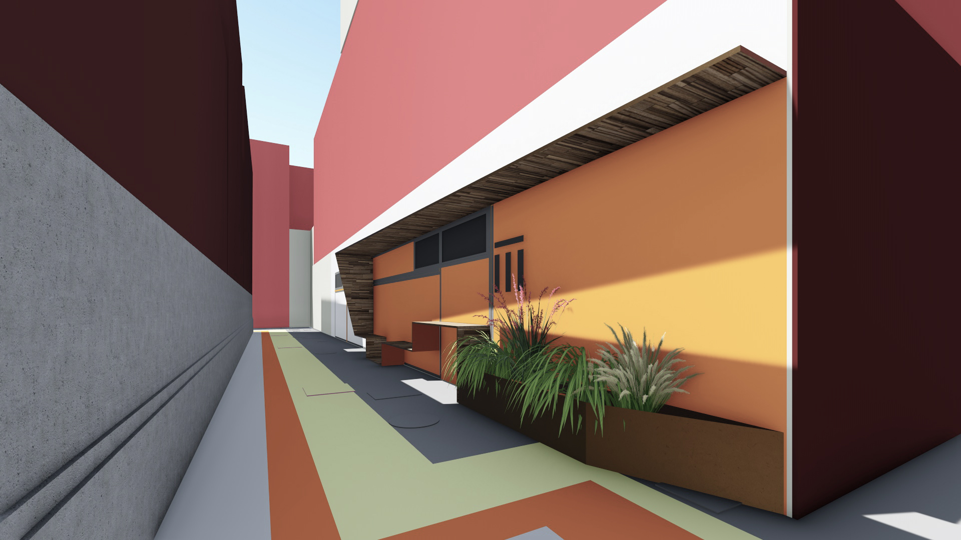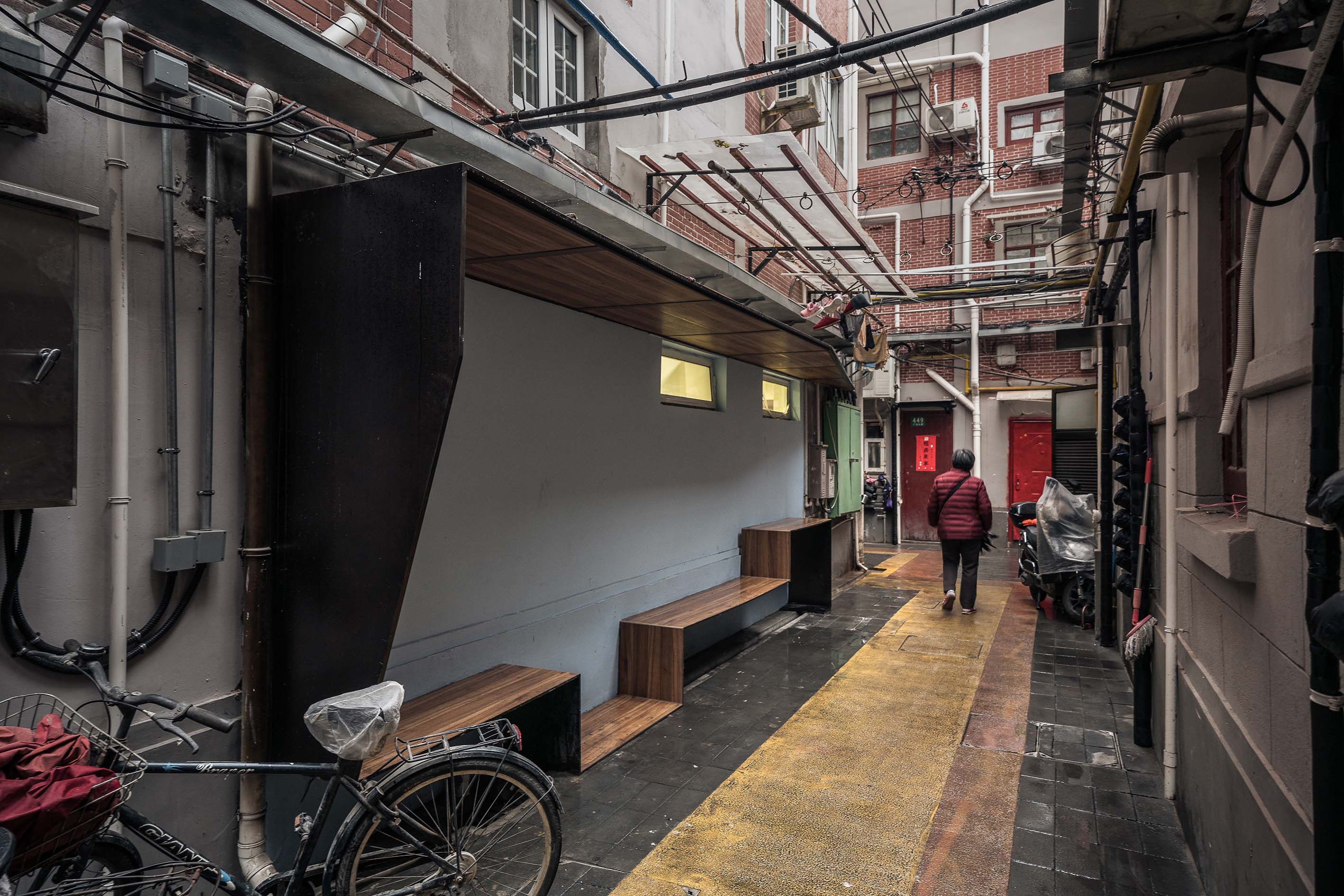 综治中心的背立面作为一个稳定完整的界面并没有得到充分的利用。设计师将原有窗户改为高窗,能避免与居民的视线干扰,也省去了防盗窗的做法。在墙体上设置整合了雨棚,坐凳和吧台功能的一体化装置,满足居民休憩,娱乐的需求。