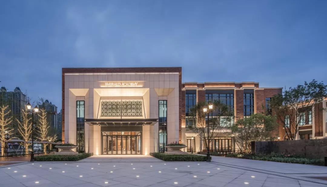 翡翠书院融合美式学院派和现代建筑风格,注重建筑细节,带有古典情怀,具备化繁为简的自然美。壮观大气的建筑围合布置,最充分体现了中国传统“天人合一”的思想,建筑立面在看似平常的处理中透露出一种直率的美感和低调的张扬,并在对绿色的原始向往中,创造了人、自然与建筑的和谐共生。