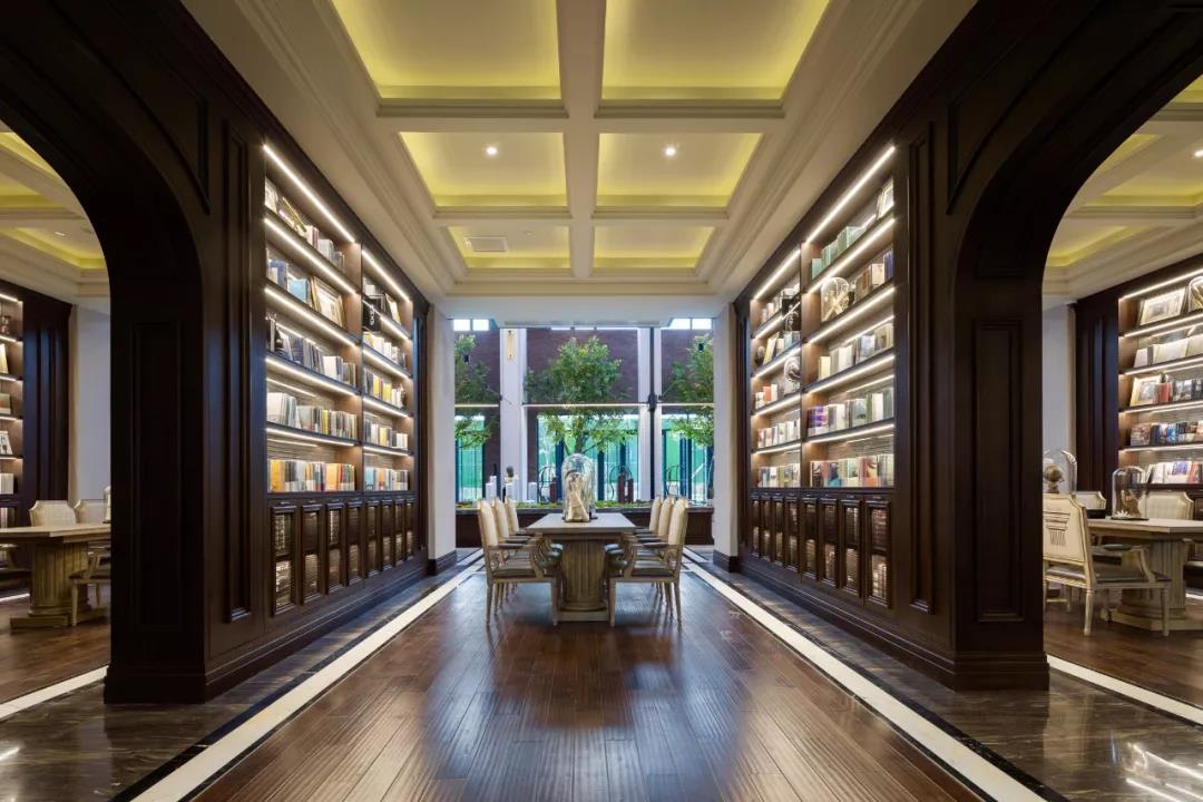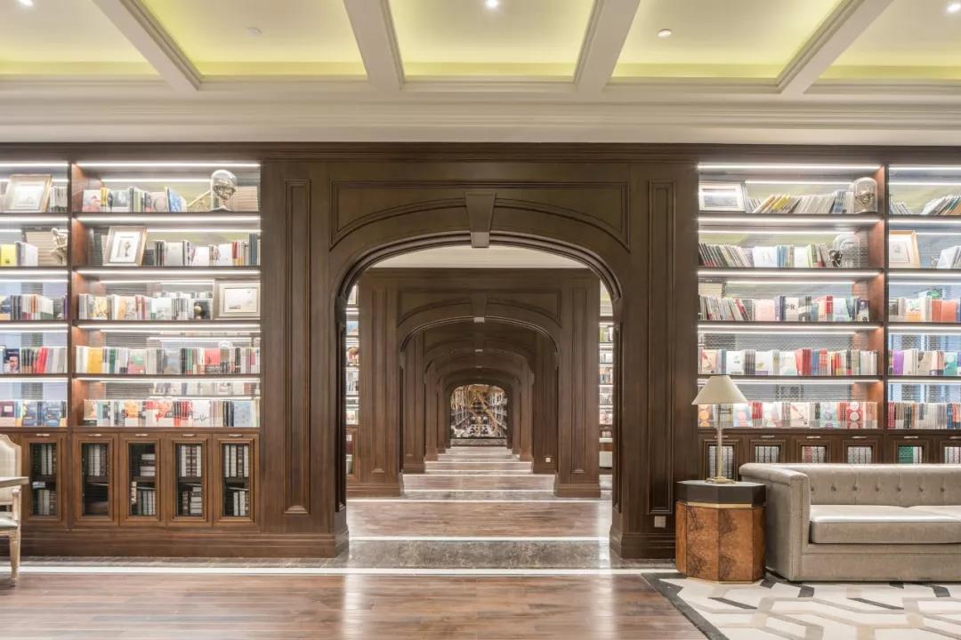 随后步入艺术长廊,半弧形的拱廊采用了贴近自然的实木,层层迭至,延展开来。书架上摆放着各种类型的图书,坐在淡黄色的暖光之下,窗外点点绿意透过大面积的玻璃窗映射出来,优雅文艺的氛围油然而生。