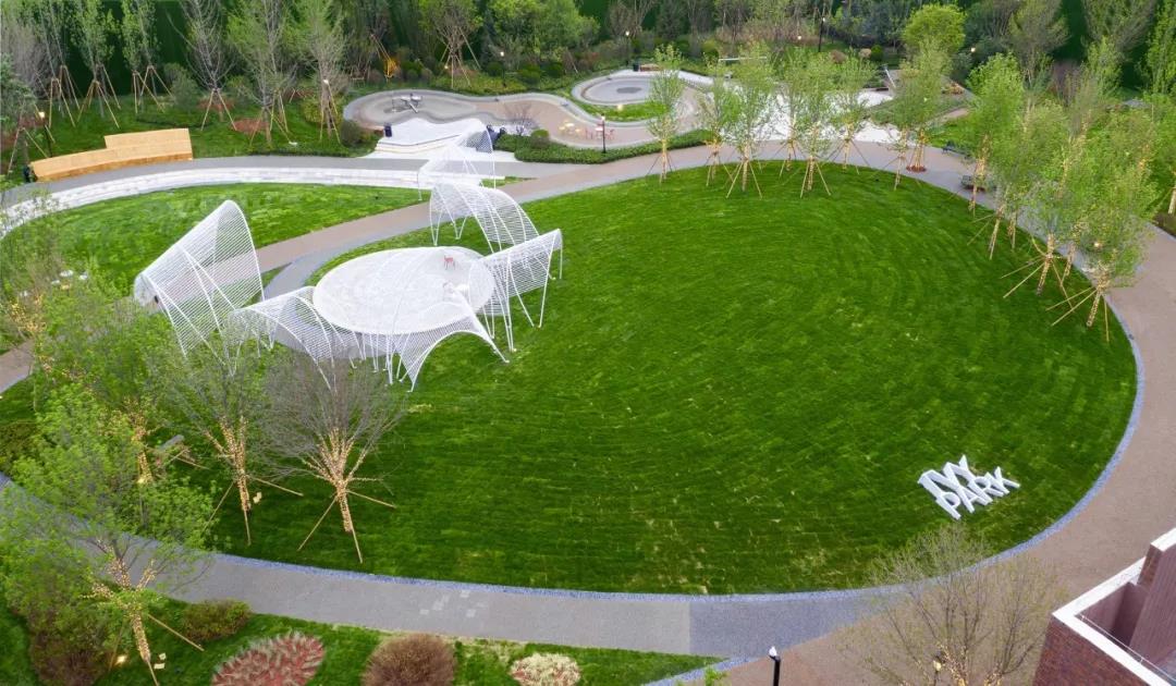常春藤公园以其轻松自然的景观环境与西面建筑的浓烈形成对比,开放的草坪上放置着的小舞台有着夸张而饱满的艺术造型,柔中带刚,曲线的形式给人以欢快的气息,给人们提供了良好的交流互动的平台。