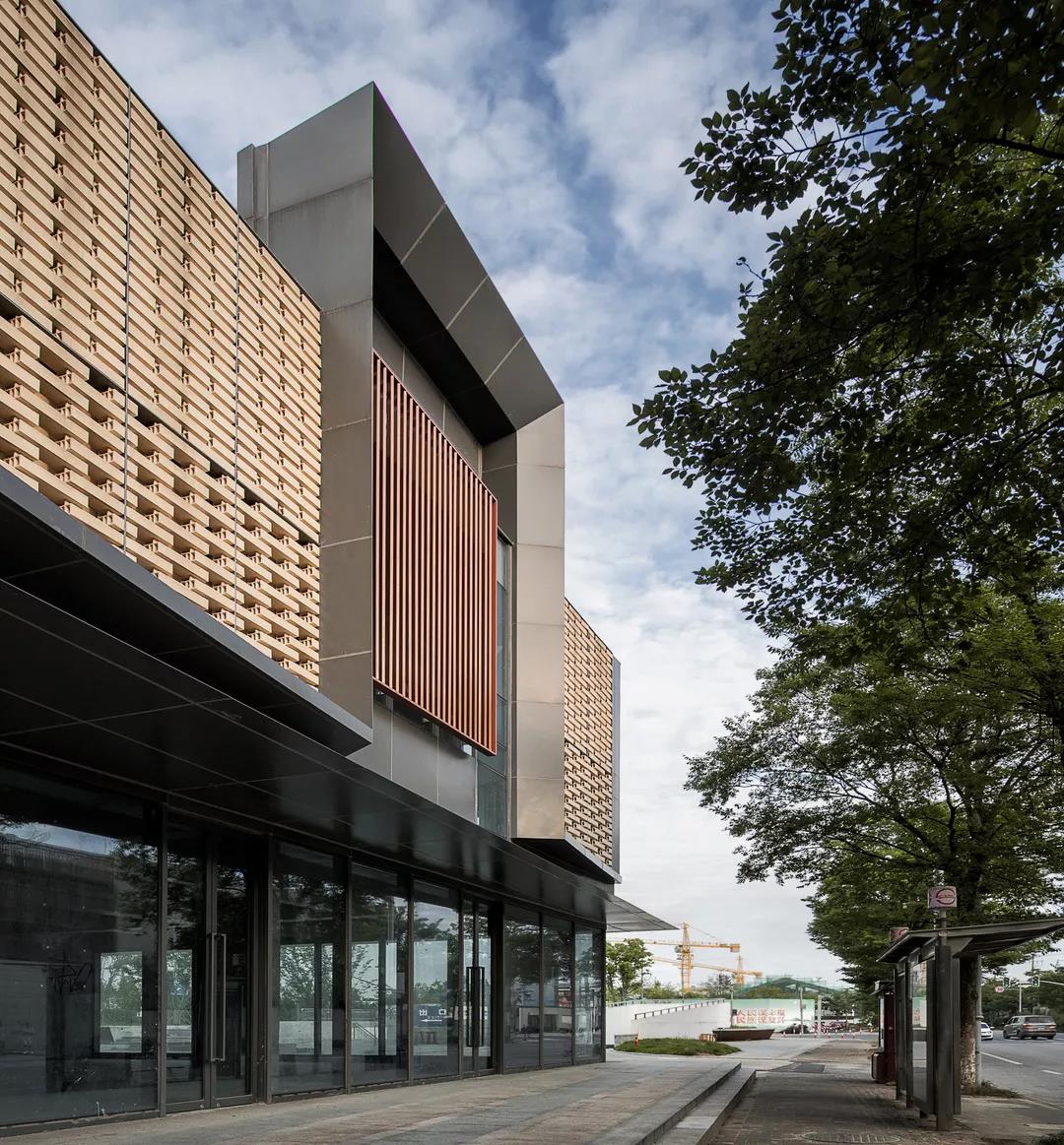材料选用上呼应古镇传统,融入现代风格特色,选用了石材及金属板。石材采用干挂做法,通过不同形式的分缝以及不同形式的石材表面处理组合,再搭配金属压边和百叶,巧工独匠,在立面上呈现出精致多样的效果,与精品商业的气质相融合。