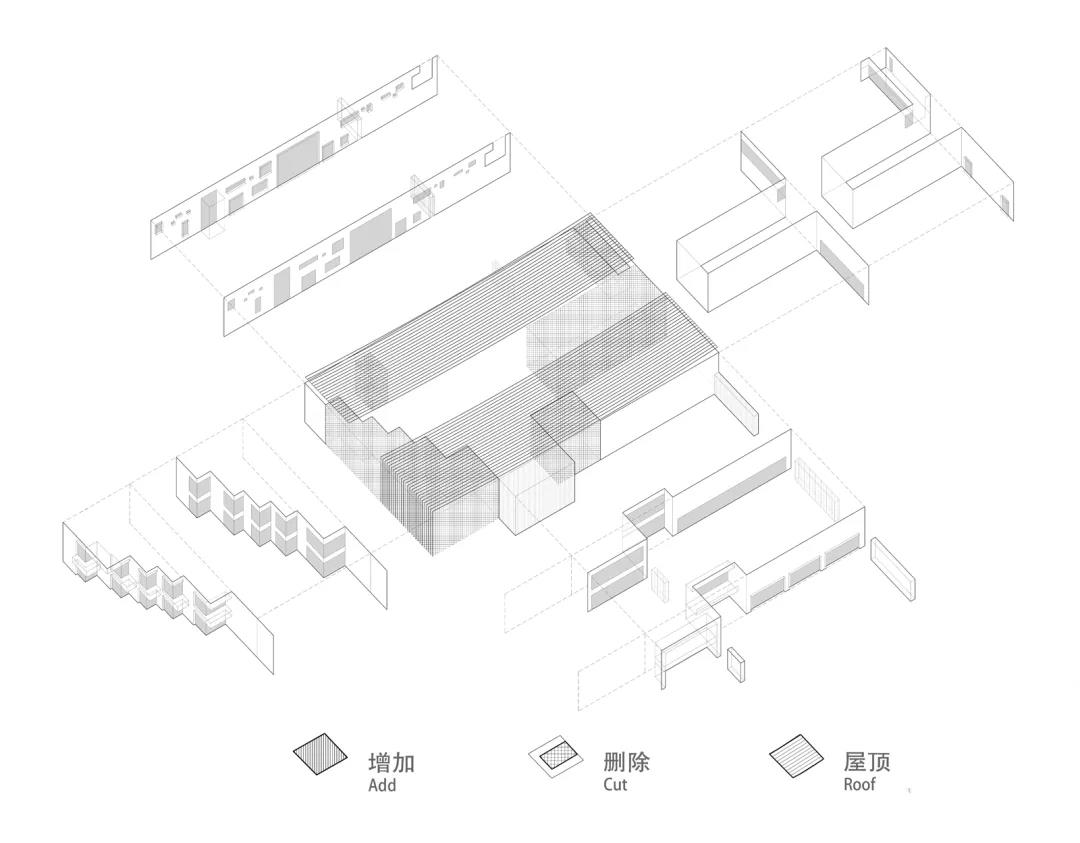 建筑的屋面由两道微垂的弧线构成,将传统元素进行现代语境转译,利用格栅所限定的体量做加减法上的“掏空与补全”。