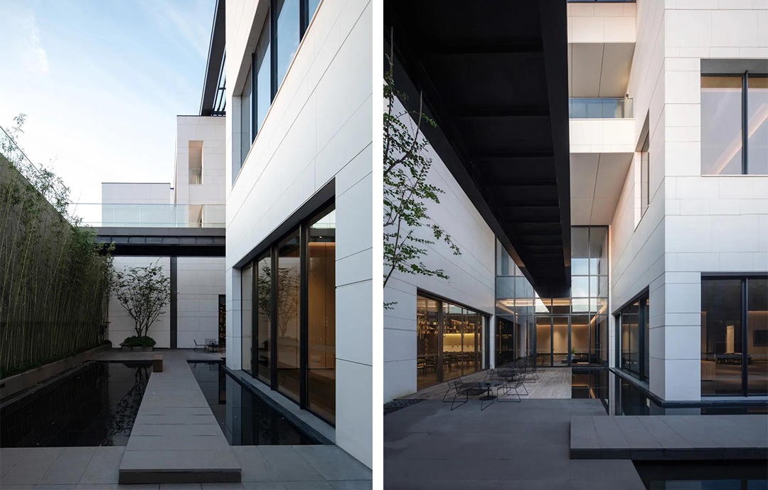 建筑采用两种色调,白色与深灰色。选用质感与耐久并重的白色砂岩和铝材,以现代工业技术呼应江南的水墨意境,与当地民居院落的形象保持一致,微妙谦和地融入环境。