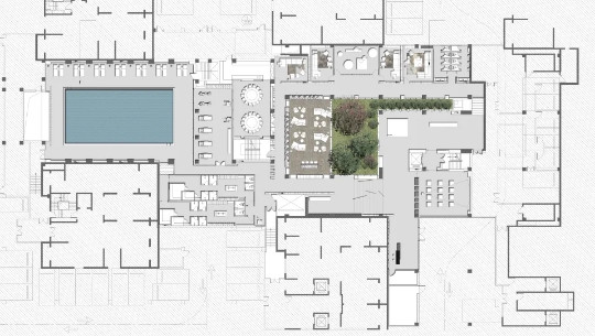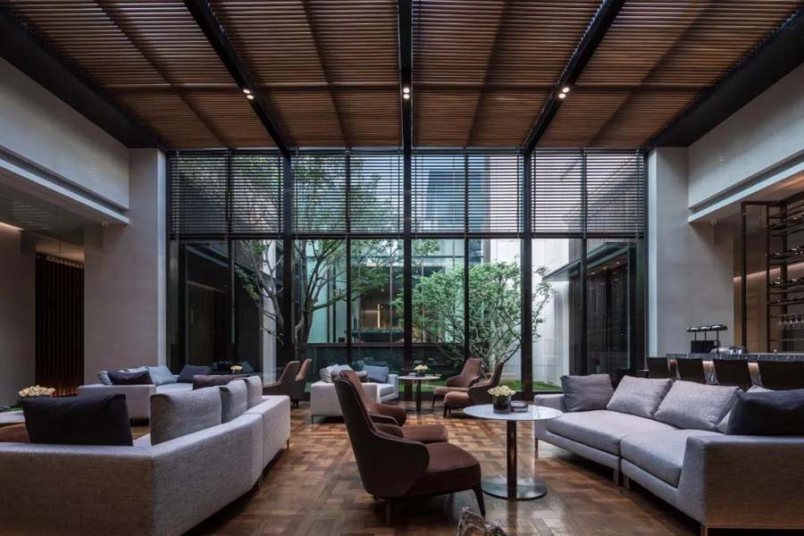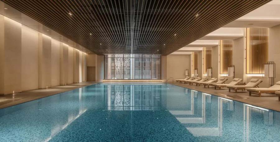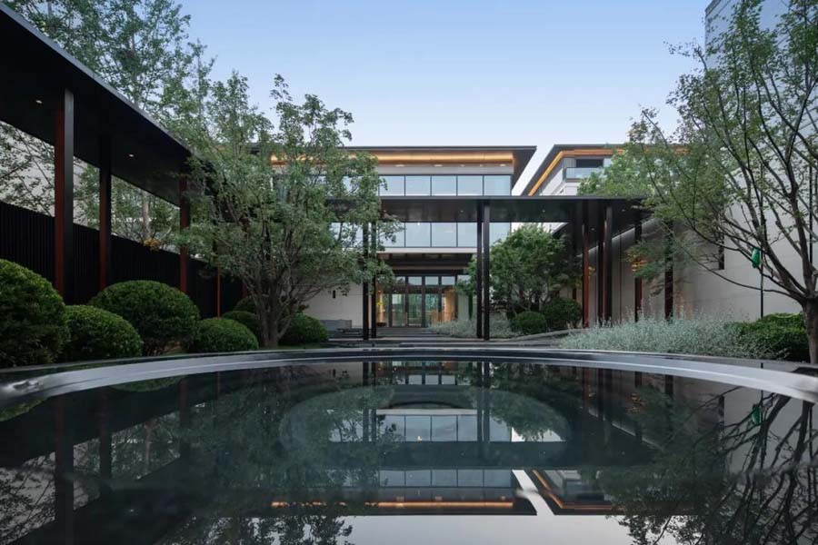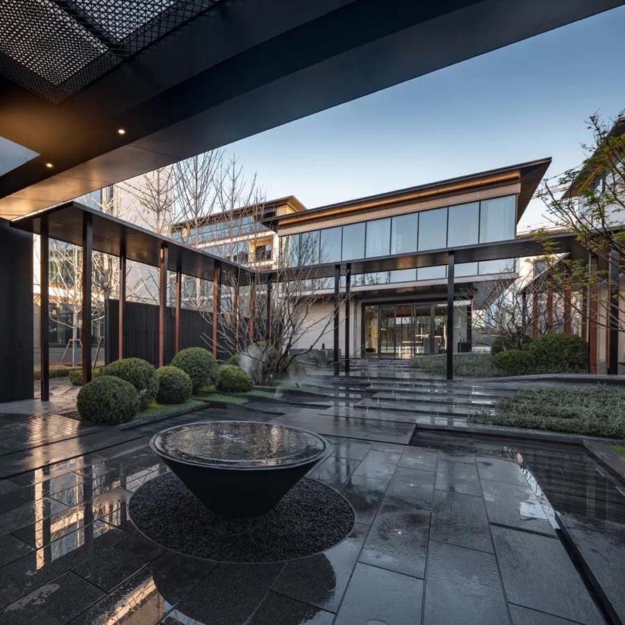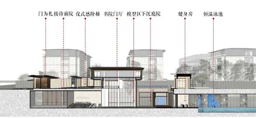 体验区结合南入口、书院、下沉庭院设计,由地面接待门厅和地下会所组成,会所泳池、健身房等功能实景展示。