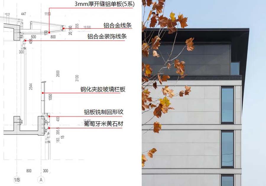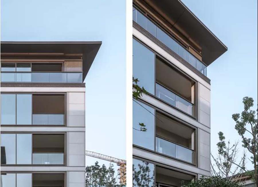 屋顶挑檐使用的是在航空航天等高精尖产业应用的5系铝板。5系铝板一般铝厂极少存货,密度小、质量轻、强度高、耐腐蚀、易于涂色、散热性能好、抗压性较强,施工工艺中对强度、平整度、色泽要求极为严苛,建筑产品极少采用。