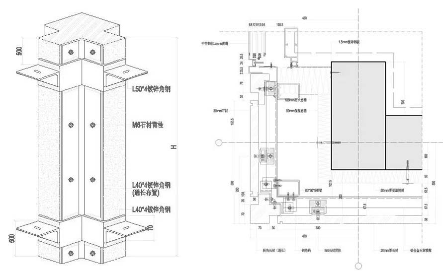 为了让建筑的棱角更加挺拔、更加俊俏,每个转角都选用一根3米长的完整石材进行安装,比传统的海棠角更加自然流畅,但为之付出的代价是从林林总总的矿料中选取大于3米的荒料,再进行加工、运输、安装,不仅成本大大增加,而且施工难度倍增。