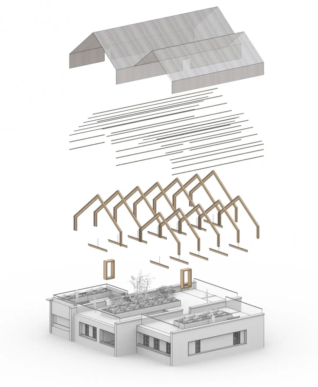 这些加建部分使住所的生活氛围与外界环境有了更为多样化的联系。连续的界面从外部的院墙延伸到小区院子内部,形成一个闭合的曲线。原有建筑、新的界面、新场所空间三种元素一起形成了这一次的更新结果。