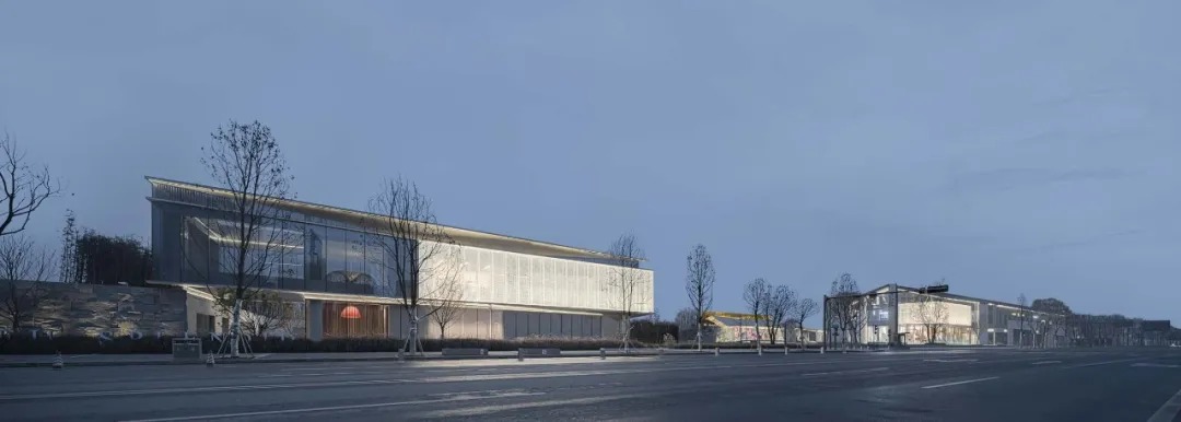 柱、梁、檩的构架编织,形成具有韵律感的立面节奏。端部旗舰店与会馆相对,通过千纸鹤折板托举的玻璃砖体量与会馆立面进行呼应,形成界面的延续性。