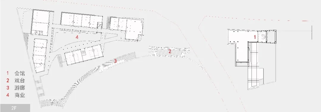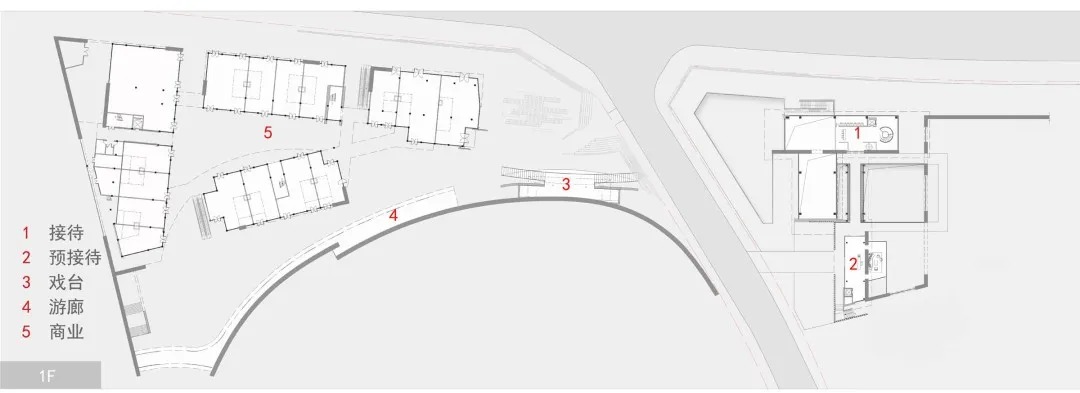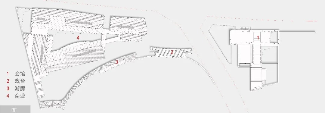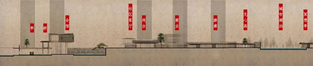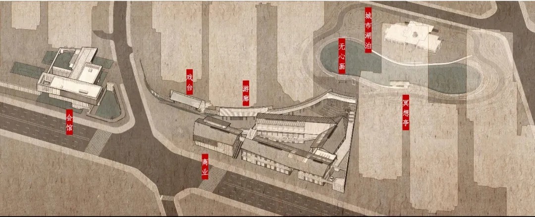 活力轴起于会馆,商业与会馆临街相对,戏台正对街角,戏台一侧是游廊,随廊深入,城市湖泊映入眼帘。