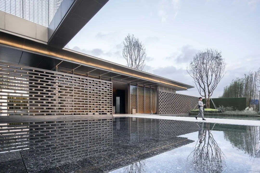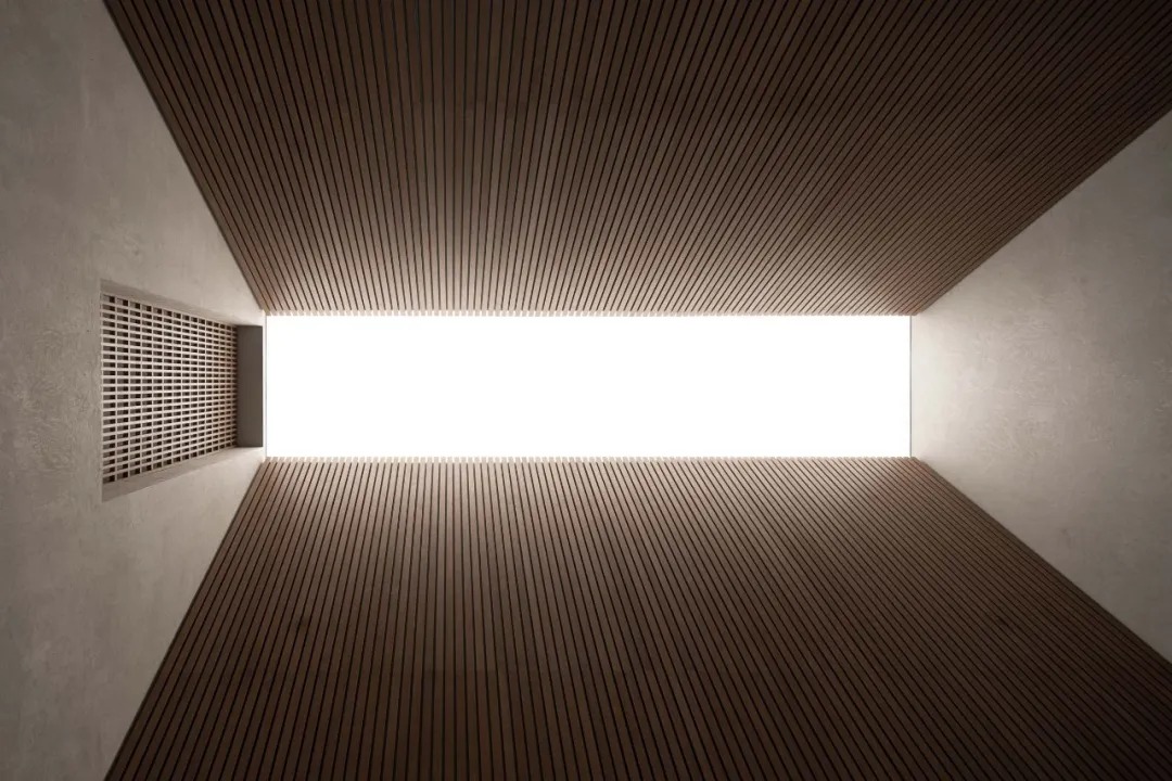 预接待厅是一个颇具仪式感的入口,步道平水面,临水漫步,入夜,两侧金属砖墙的呼吸灯映入水中,宛若星空。