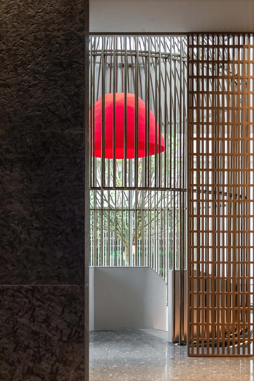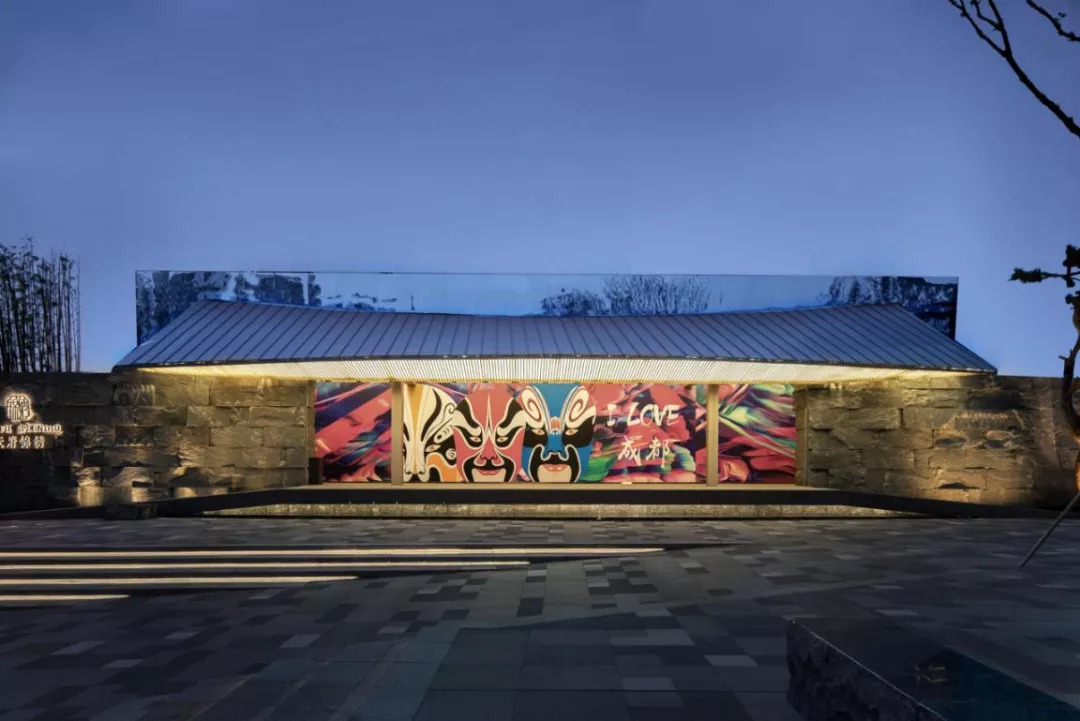 戏台采用镜面成像原理,一半实体建筑,一半镜像影像,一实一虚。格栅吊顶内置灯箱,如传统灯笼。