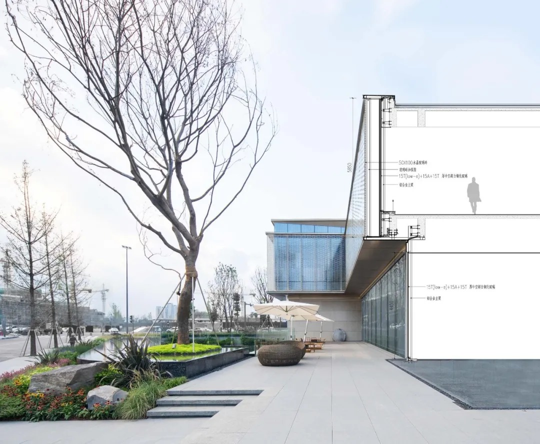 沿街立面采用高反射玻璃,使得形体更为简洁纯粹,同时反射使得建筑更加融入街道,融入城市。