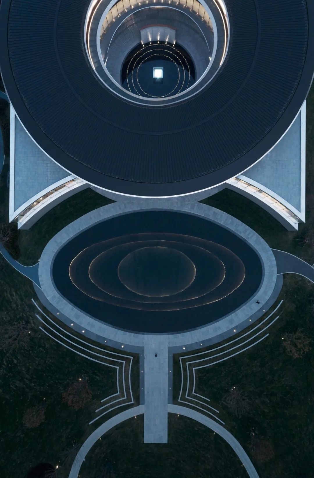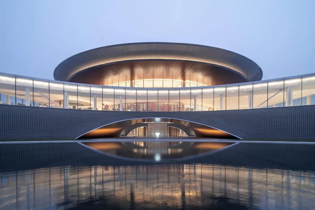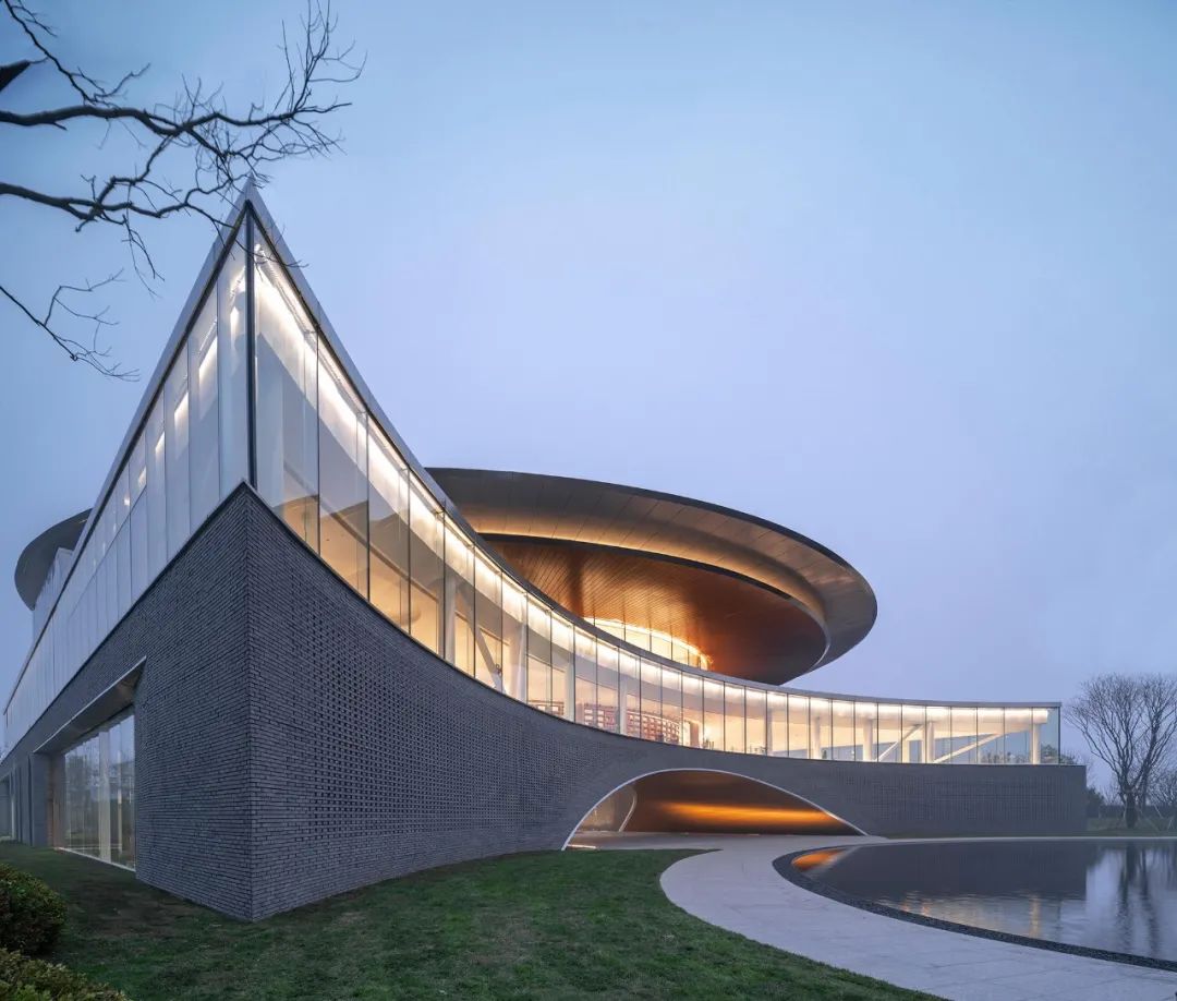 当建筑倒影于水面之上,虚实相间的两道弧线形成了一只眼睛,而通过这只眼睛仿佛望向时间与空间转换的交汇之处。