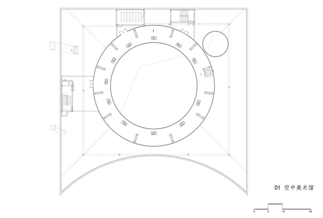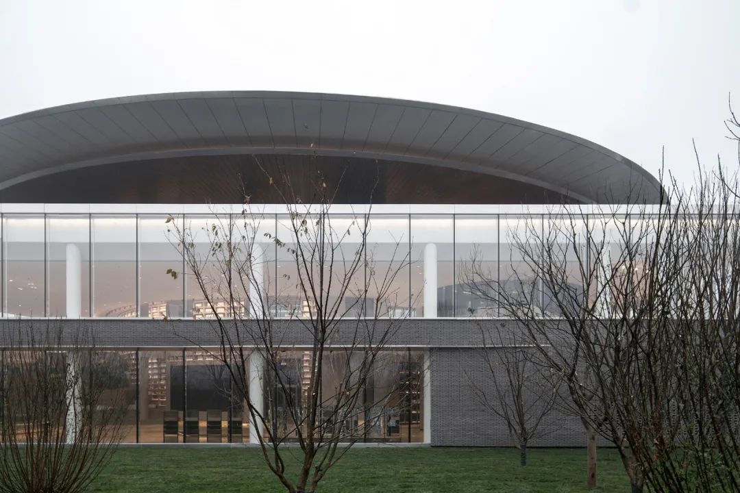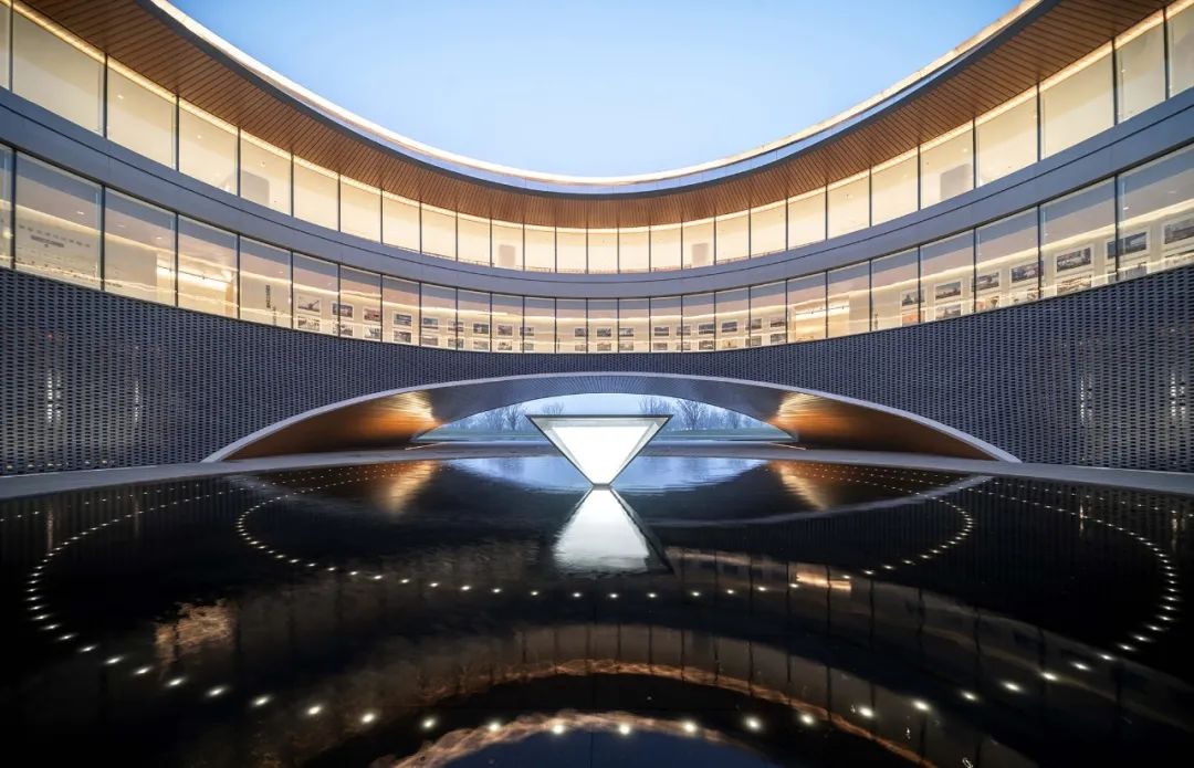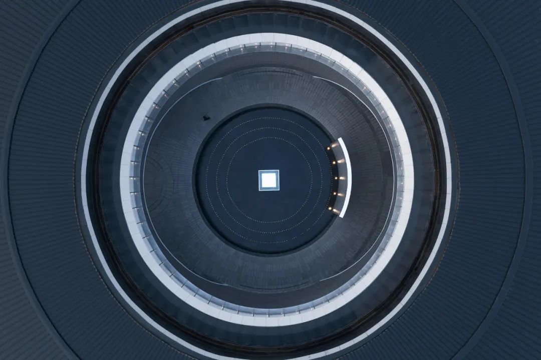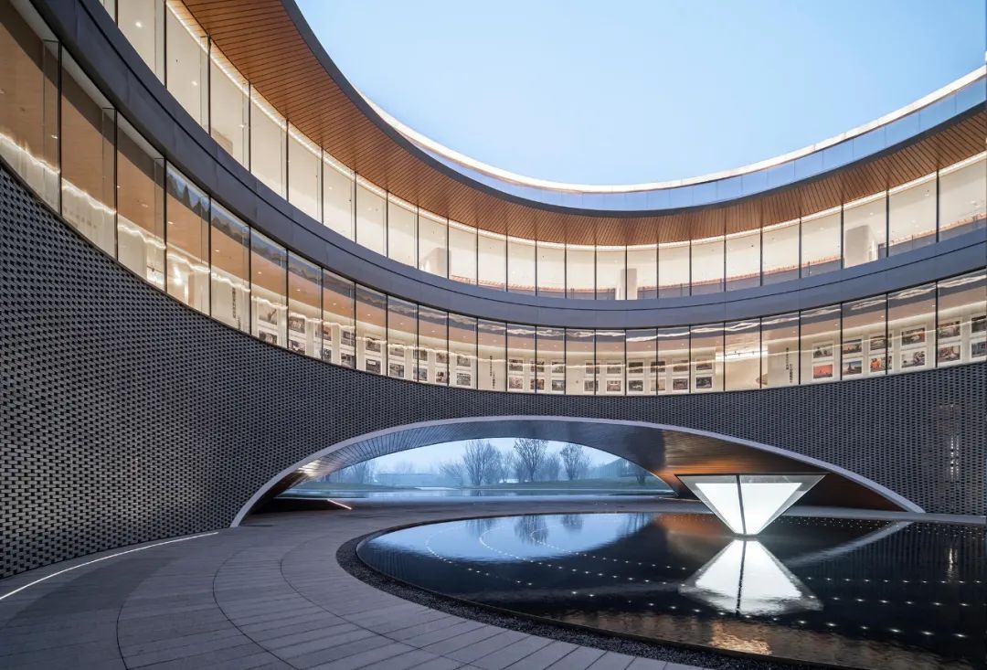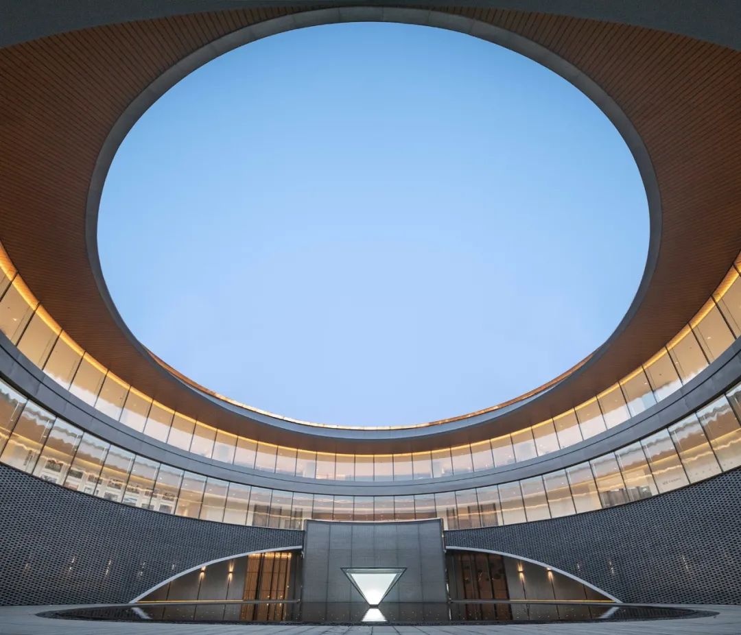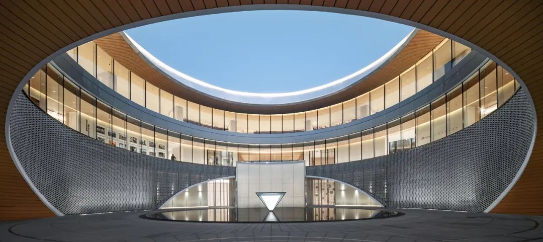 建筑内部的圆形空间,取意于中国传统建筑中的“庭”与“院”的概念,又如中国古时的良渚玉琮,内圆外方,中穿圆孔,贯通天地。