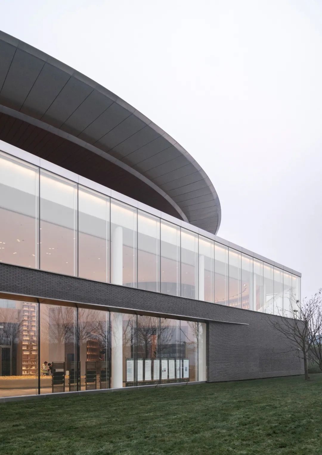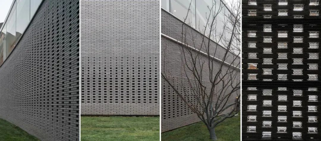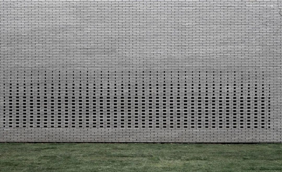 建筑一层分为外部曲直相交的方形砖墙与内部圆筒砖墙,由10万块陶砖组合而成。通过大面积实体错缝拼接与局部渐变镂空的砖墙组合方式,达到纹理渐变效果,其中在转角与窗户交接处分别做了锐角收分处理,让细节更为挺拔。