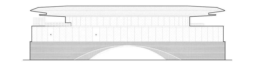 西立面作为建筑的主要展示面,可以概括为由主要的三道弧线构成。其中第一道弧线为寰宇华盖之弧,意为空间。第二道弧为四方五位之弧,意为时间。老子说:“大方无隅。”方在其终极之处,是与圆和谐统一的,这是方与圆在中国哲学上的辩证与统一。