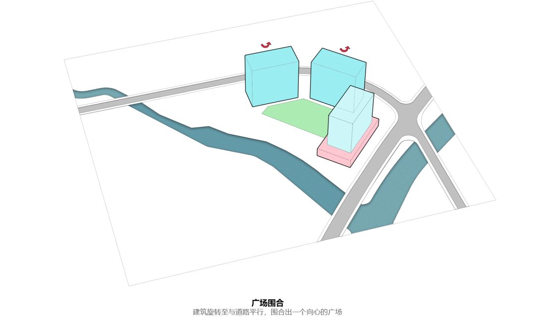 甲方对规划提出的诉求是除了自己使用的总部大楼之外尽可能分隔成多栋独立办公楼,方便其相关企业能够互不干扰的独立办公的同时,多栋建筑围合成一个内部开放空间成为大家可以交流的场所。因此要满足独立的前提下同时要避免栋数过多而压迫内部开放空间。另外主入口处布置一部分商业以及企业展示空间。