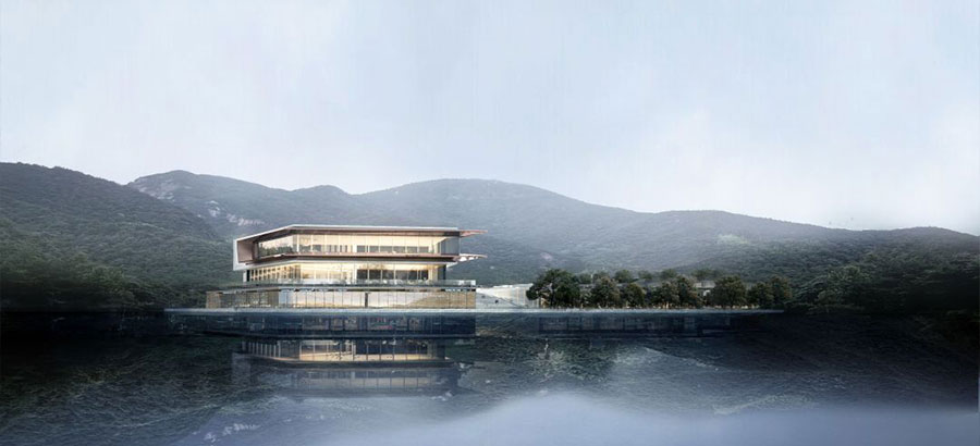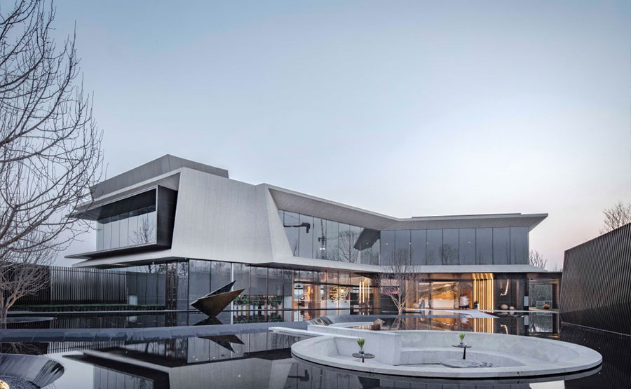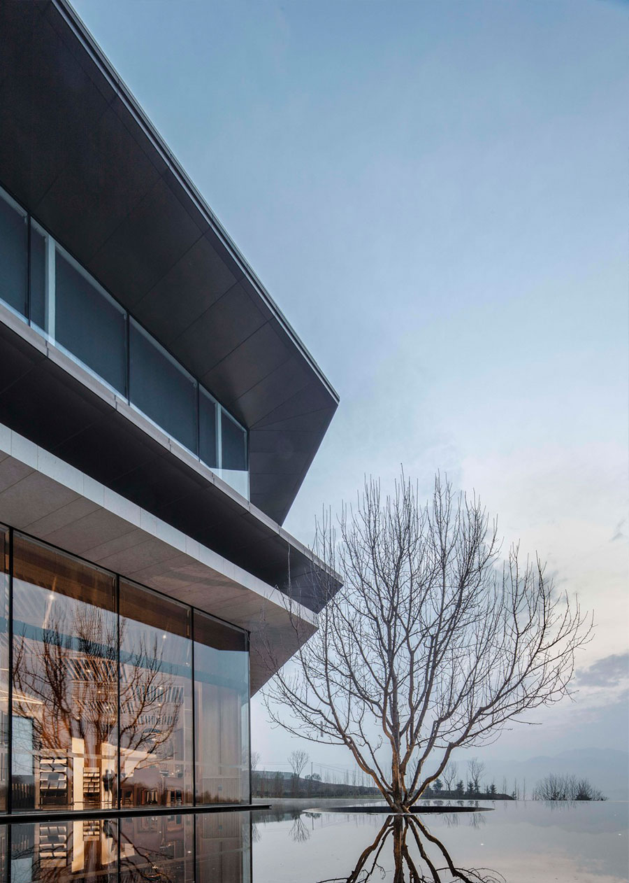 两层建筑体量沿湖面借势延展,建筑一层设计为全通透玻璃幕以实现内部观湖的全景视野。上层体量悬挑于空中,以折板形态构成多个景框,与外部环境产生互动。实体部分利用石材和金属两种不同材料形成相互套叠的效果,使整个建筑呈现出现代雕塑般的张力。