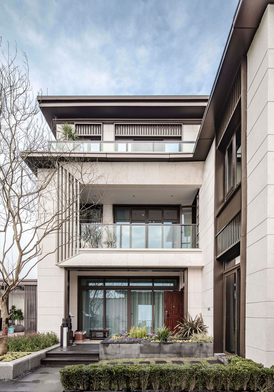 别墅立面设计简练通透,明快细腻,注重触感和细节的感官体验。双层金属挑檐提炼自传统重檐形制,沉香米黄仿石墙面与深咖色铝板挑檐搭配,暗合中式的粉墙黛瓦。结合斜切面母题,在阳台设景框造型,将湖景引入视野。侧面金属格栅作为点睛之笔,半虚半实,落落光影,更添文雅之感。整体氛围既体现现代建筑的简约之美,又蕴含中式建筑的清雅意境。