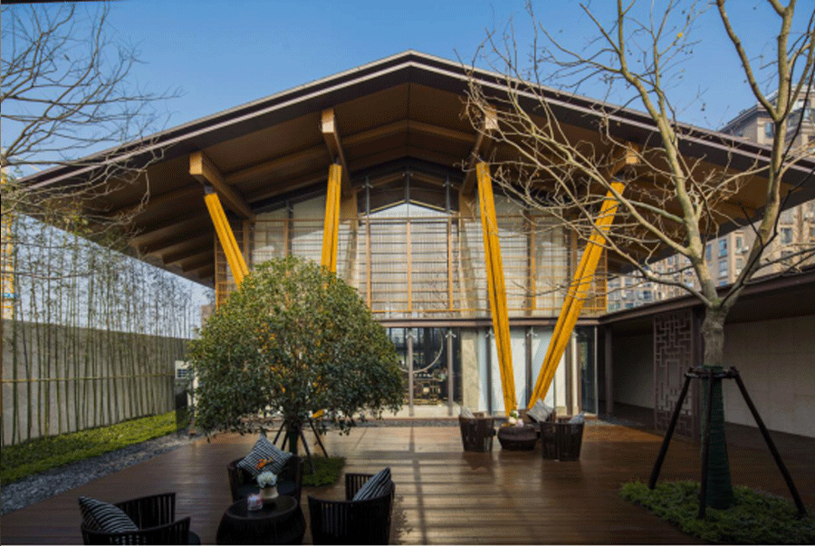 “南方建筑为棚,多敞口,以敞口之建筑,配茂林修竹之景,园林之始,于此萌芽”大尺度出挑的屋檐,和大面积开敞的立面营造出十足的空灵感。屋檐下的举架、椽子和立面上的木色屏风打破了建筑的体量感,使建筑轻巧、富于流动性,弱化了主体建筑使整个群体空间更加统一。