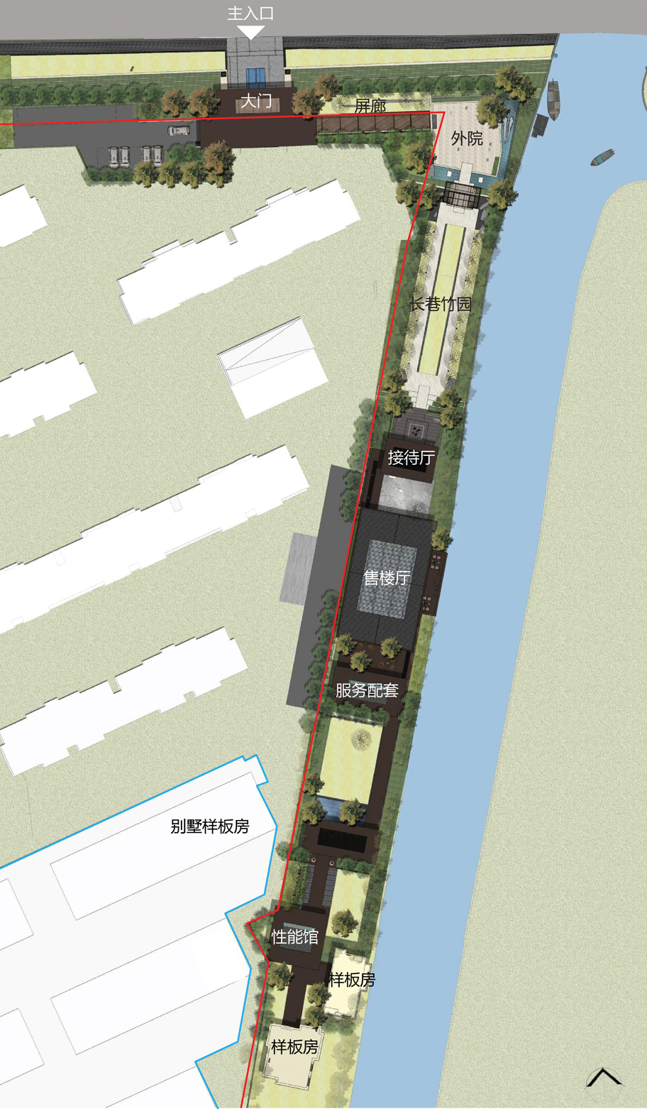 示范区基地选择位于项目用地东侧沿河绿化带,呈条带状。特殊的地形,大纵深的建设用地与古代书香世家的礼序之道恰好契合。“埏植以为器,当其无有器之用。凿户牖以为室,当其无,有室之用。故有之以为利,无之以为用”。江南园林的意境并不体现在建筑实体呈现出的界面,更多的蕴涵于由实体与景观共同界定的多重空间内,在”庭院深深深几许,寂寞梧桐锁清秋”的意境空间中更强调的是层次与意境的匹配方式。
