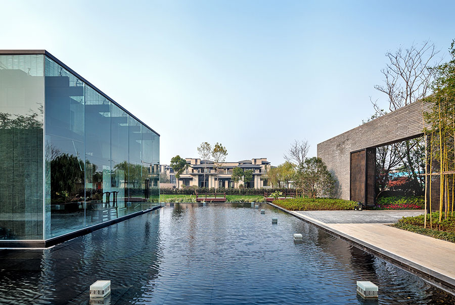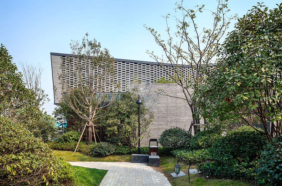 建筑采用现代建筑风格,并运用体块穿插手法,虚实对比处理从而达到强烈的视觉冲击力。主体周边的水景,及深色院墙则给建筑带来片刻宁静,院子文化在这里得到诠释。