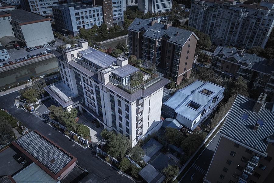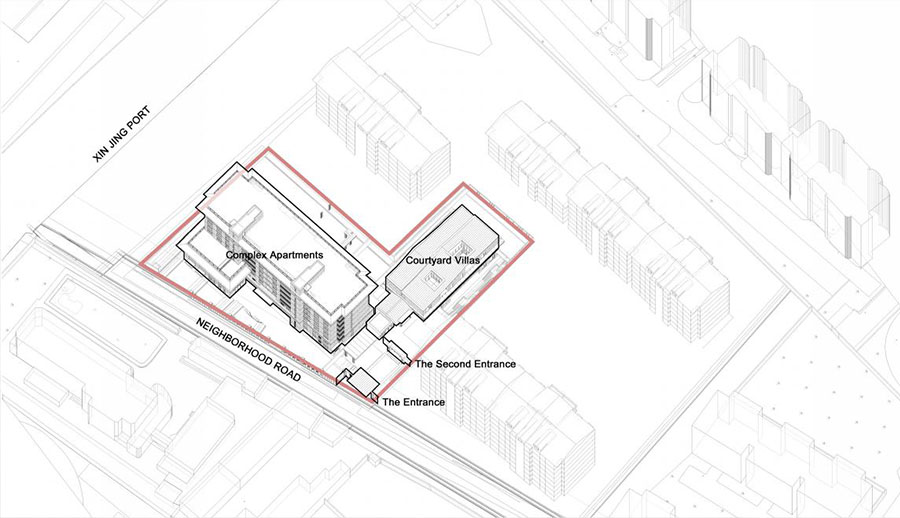 在尊重现有地段环境的前提下,寻求多样化的地块结构和多元化的表达形式。思考如何使得原本消极局促的地块空间变得有趣味。我们一开始就回应地块特质,突破单一匀质的地块结构所产生的呆板空间形态。利用地块不同的环境属性特征,研究不同密度、空间、产品类型的组合布局方式。形成了“叠合垂直性的复合式公寓+舒展水平性的院落式私宅”的空间布局,构筑出整个地块的使用效率。