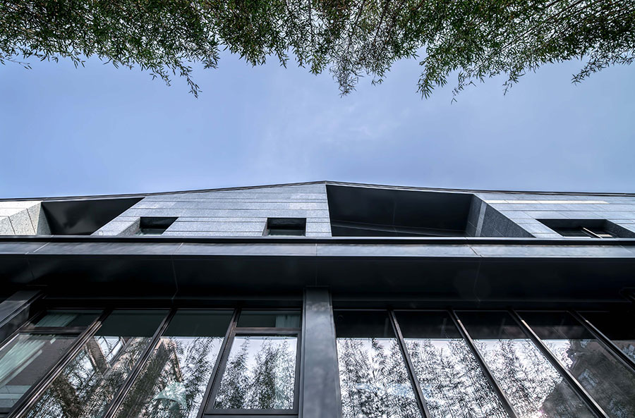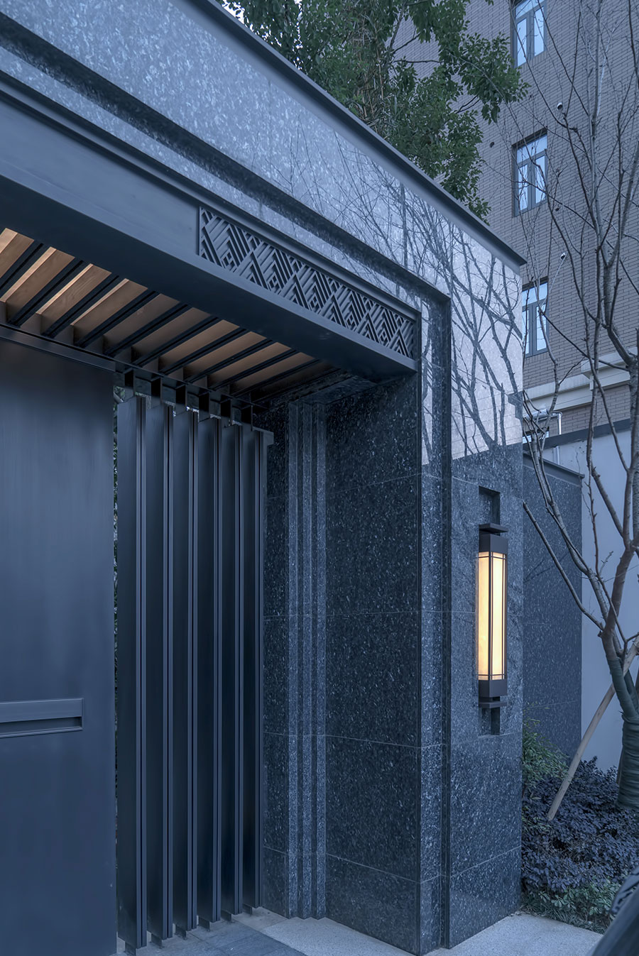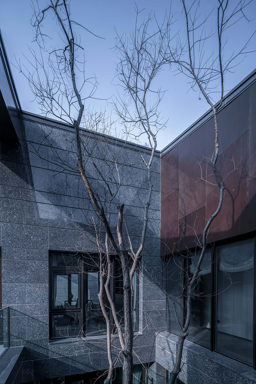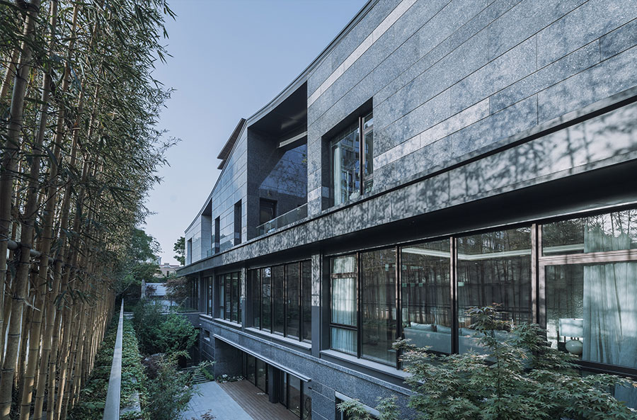 材料控制的背后是沉积的情感体验。立面材料以素净的白玫瑰石材,搭配蓝麻石材为主。结合宽窄条变化的拼接方式以及局部的机切面条纹的细节处理。强调了建筑自身的温和内敛,营造了一种含蓄素净的审美基调。石材的隐逸,金属的细腻反光,木纹板的温润张力,以及玻璃影射的暧昧。在天花树枝剪影的映衬下,于诗性的悠缓时空中,述说着禅境。