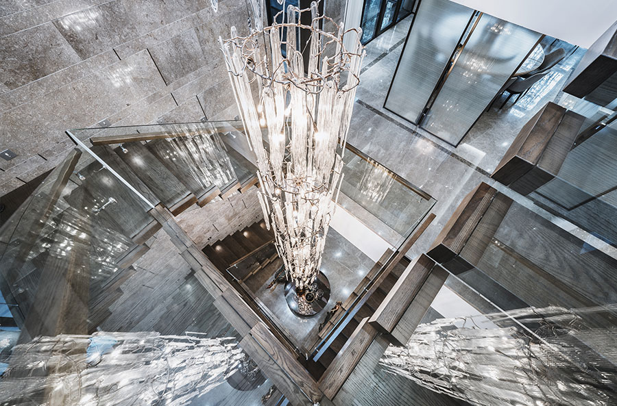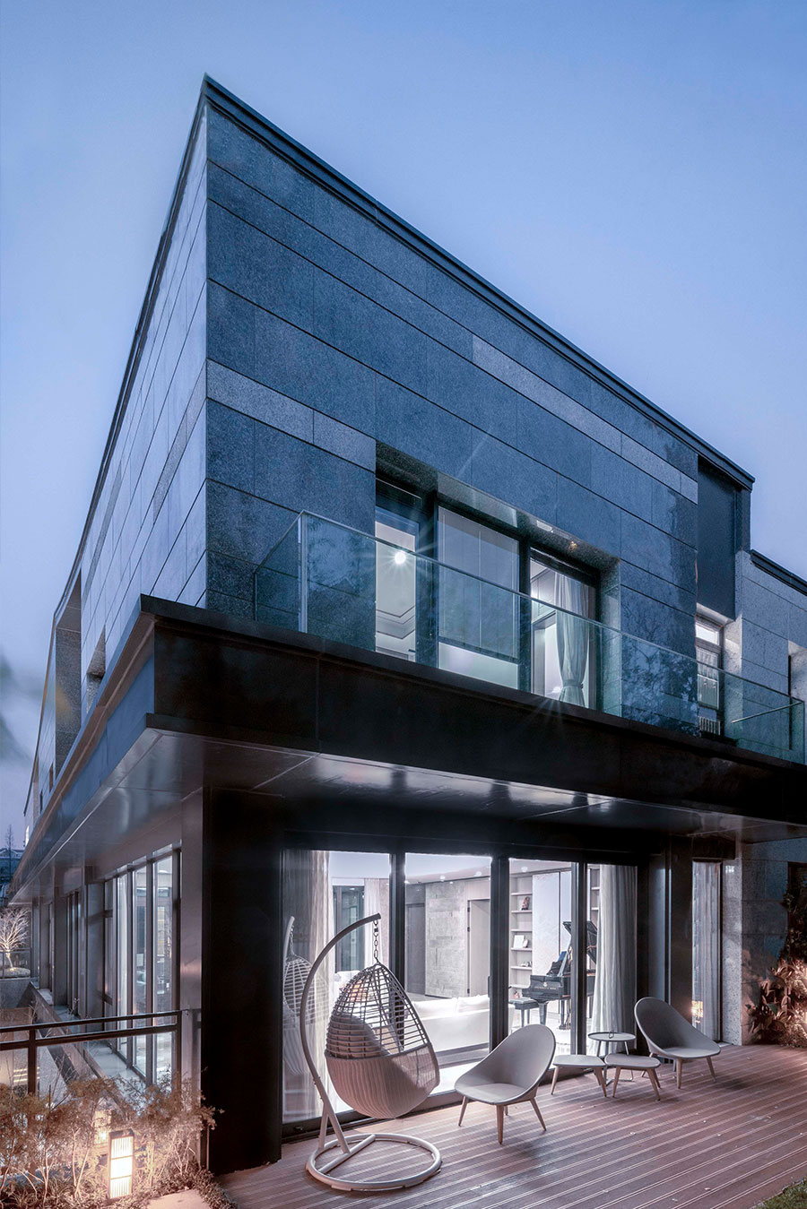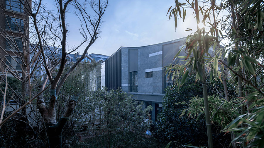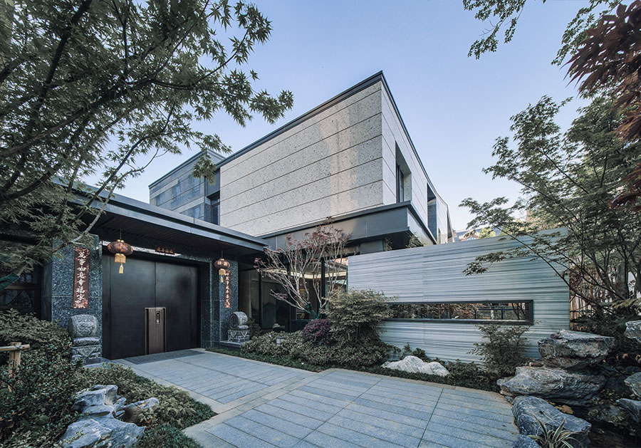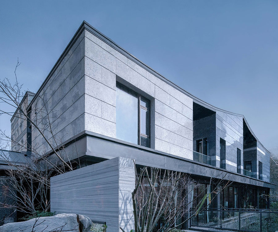材料控制的背后是沉积的情感体验。立面材料以素净的白玫瑰石材,搭配蓝麻石材为主。结合宽窄条变化的拼接方式以及局部的机切面条纹的细节处理。强调了建筑自身的温和内敛,营造了一种含蓄素净的审美基调。石材的隐逸,金属的细腻反光,木纹板的温润张力,以及玻璃影射的暧昧。在天花树枝剪影的映衬下,于诗性的悠缓时空中,述说着禅境。