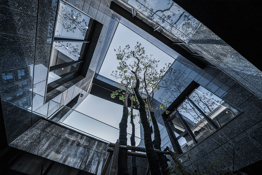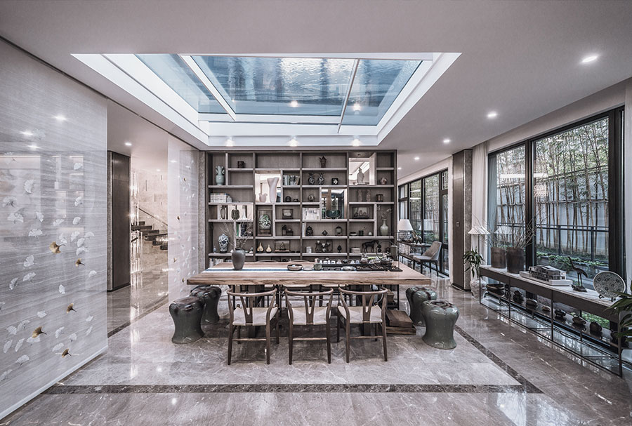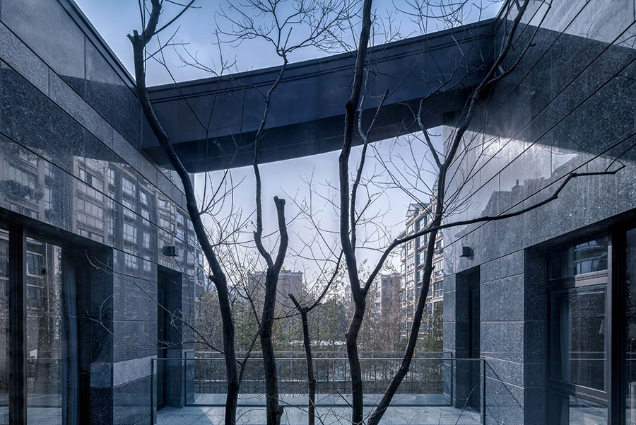 沿着室内廊道前行,两个院子插入到空间变化中。围绕两个院子,形成了一条回转的流线,于循序渐进中呈现舒卷而出的气场。传统园林的精致诗意与空间语言,被探索性地营造出“庭院静,空相忆”的空灵之感。