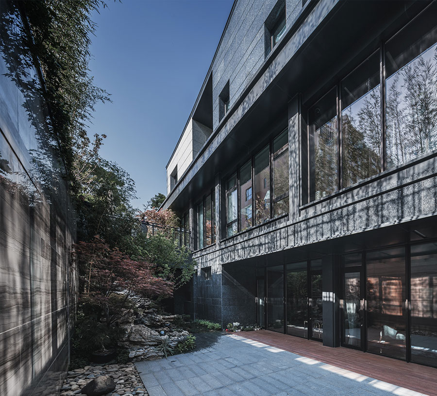 私宅的设计策略是充分利用L型地块“边角料”的东西向纵深空间,形成了舒展水平关系的“院落式布局”。平衡了地块中原本消极的位置关系,在局促的地块环境肌理中嵌入具有文化情感意识的居所空间。当然这不仅是一种几何学意义上抽象的空间设计,更是一种基于经验和情感,根植于所处地段的图景意象。