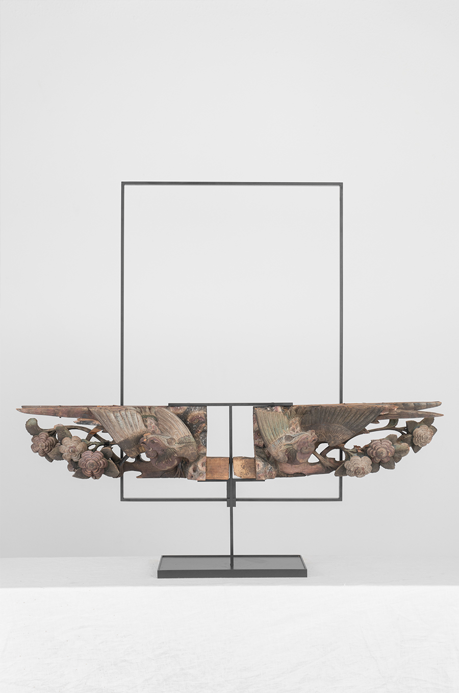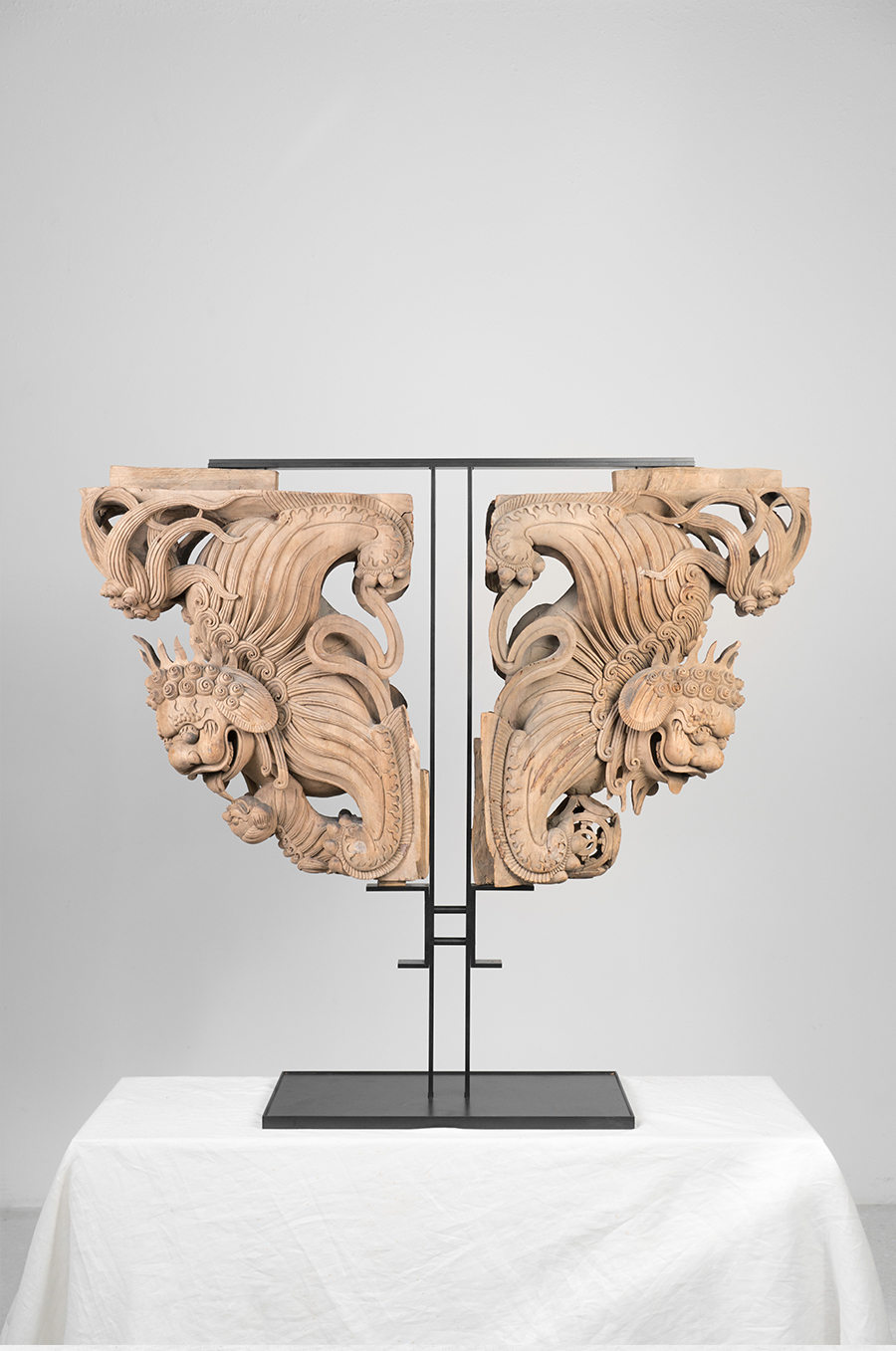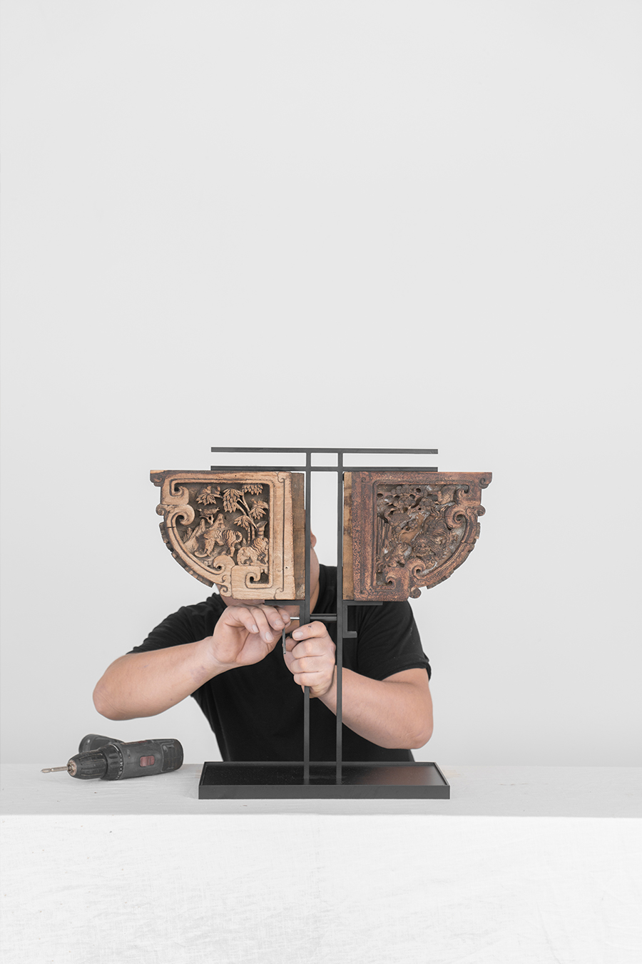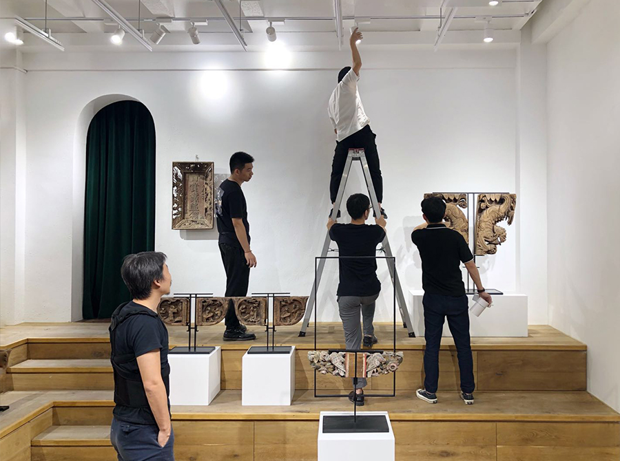 本次展览,策展人亲手制图设计铁艺支架,将传统木构件与铁艺结合,就是希望能借助设计的力量,更好的展现这些建筑部件最美的一面。其中包括利用光线运用、材质对比、不同的造型安排,分别设计了几个系列展品。