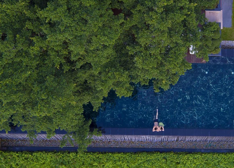 由于古树生长得茂盛,可以看见榕树繁茂的枝叶“盖”在了泳池上方。午后游泳也可觅得一丝阴凉。
