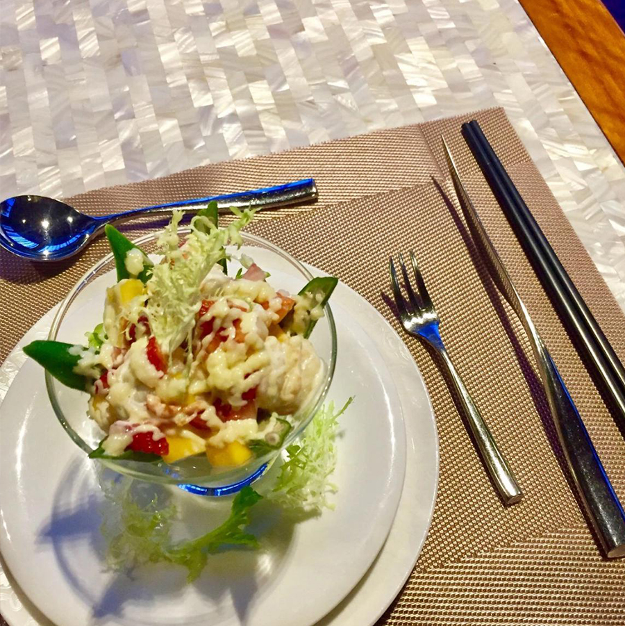 作为一个海鲜爱好者,我完全被沙拉种草了。杯子四周围绕着秋葵,特质的沙拉酱据说是主厨花了很久时间研究的成果。