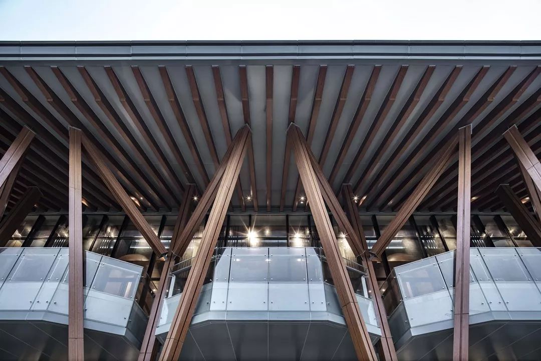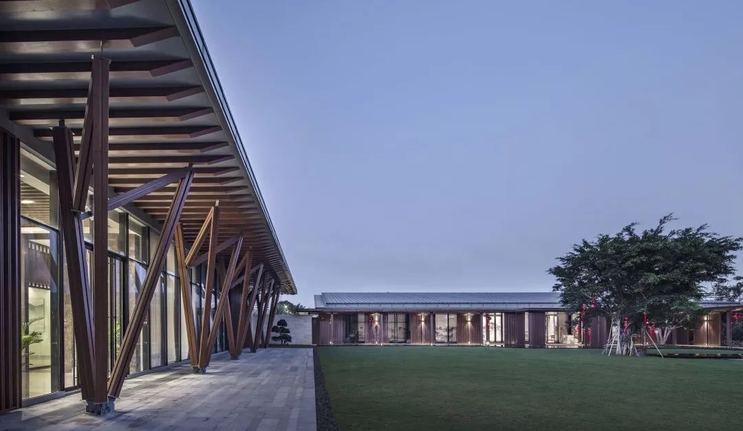 我们希望在现代风格的基础上增加建筑的细节与装饰,简洁的屋檐檐口线条收住金属屋面的同时勾勒出有力的建筑轮廓,截面不同尺寸的金属百叶设计在遮挡强烈阳光的同时增加立面的细节,我们把单调的柱廊结构设计为树枝状的形式,三维立体的构件形式满足力学的基础上表达出结构的美学,光影在走廊上随早晚阳光变化,让人更多的感受到时间的温度。