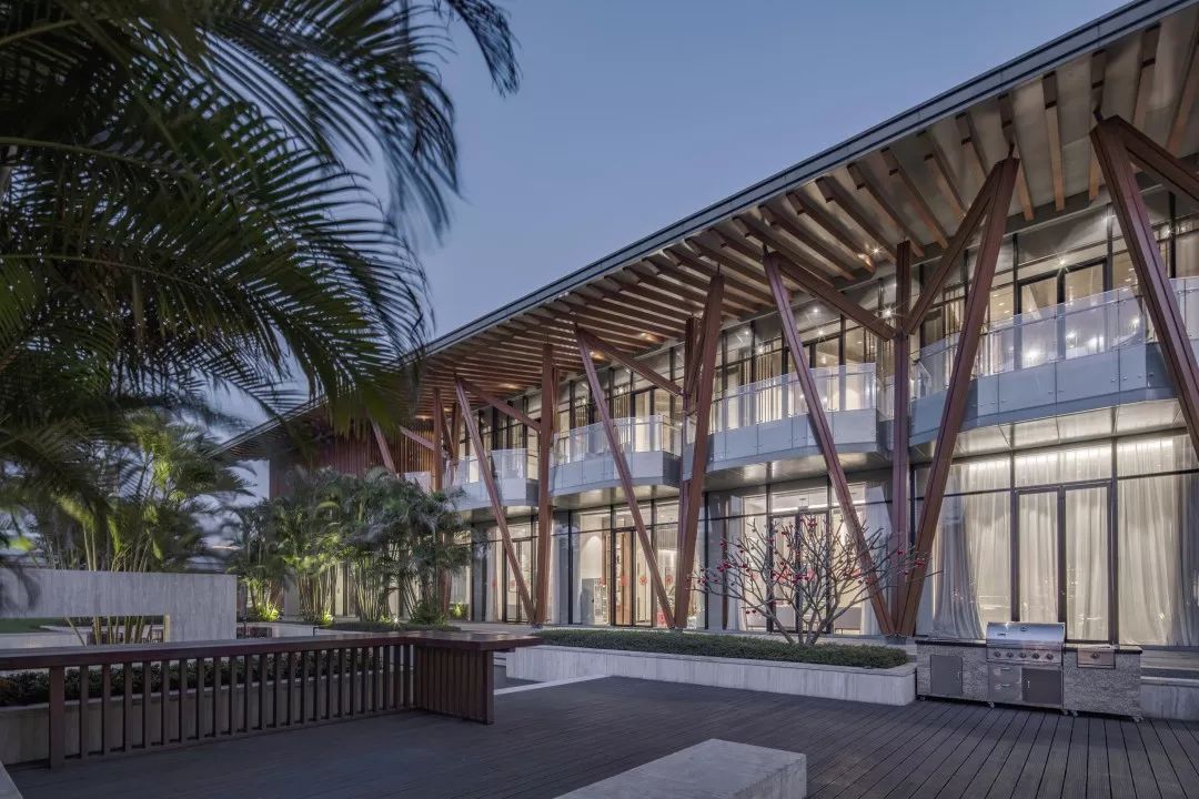 立面结合朝向和视野主次关系,遵循内外空间的联系逻辑。坡屋顶的出挑、形体的切分、立面的虚(阳台、玻璃)实(石材及百叶装饰)遵循当地强烈的阳光和气候特征而形成。屋顶的形式结合建筑体量的尺度,或单坡,或双坡,朝向不同的院落延续,削弱建筑体量过大对人的压迫感的同时,形成轻盈的活跃在浓荫中的屋顶形态。海口天气炎热,延伸出挑的屋面形成的长廊能有效遮挡夏日的阳光,又强调出建筑的光影关系;双坡顶的交接结合立面石材、玻璃、百叶的虚实变化,形成丰富的立面层次;具有装饰细部的结构柱廊和退在柱廊背后的阳台形式,增强了空间的层次和立面的个性。