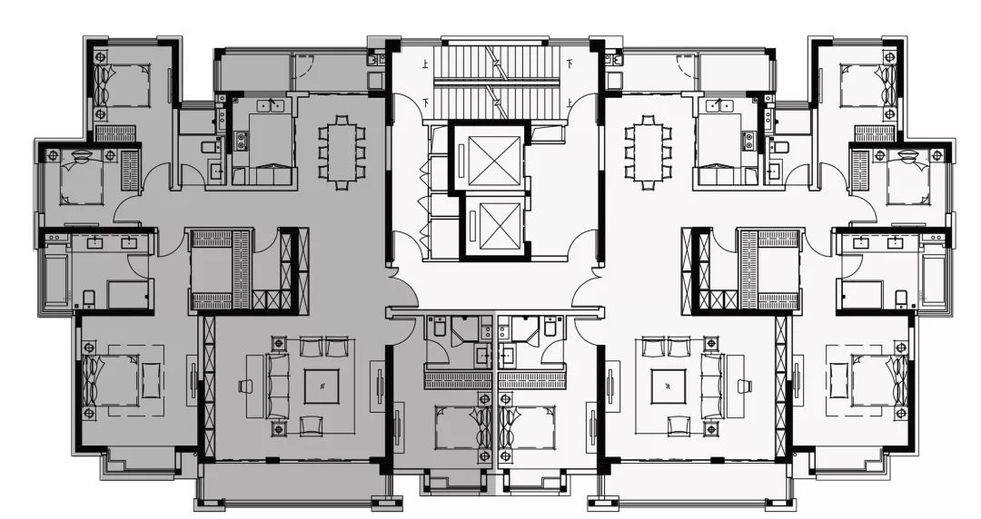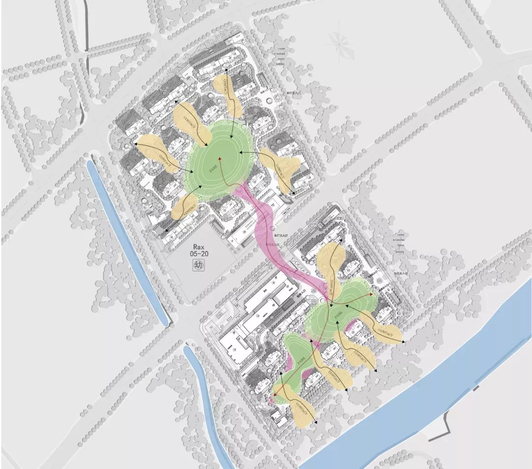 总图的楼栋布置方式充分利用胥江自然资源。南北两个地块中心景观相互联系形成主要的规划轴线,北地块大户型延轴线布局,享用小区内部中心大景观,南地块大户型延南边布局,拥有一线江景提高居住品质, 在南北两地块之间空出较大的景观空间放置两小区景观主入口,营造优美气派的小区入口形象。