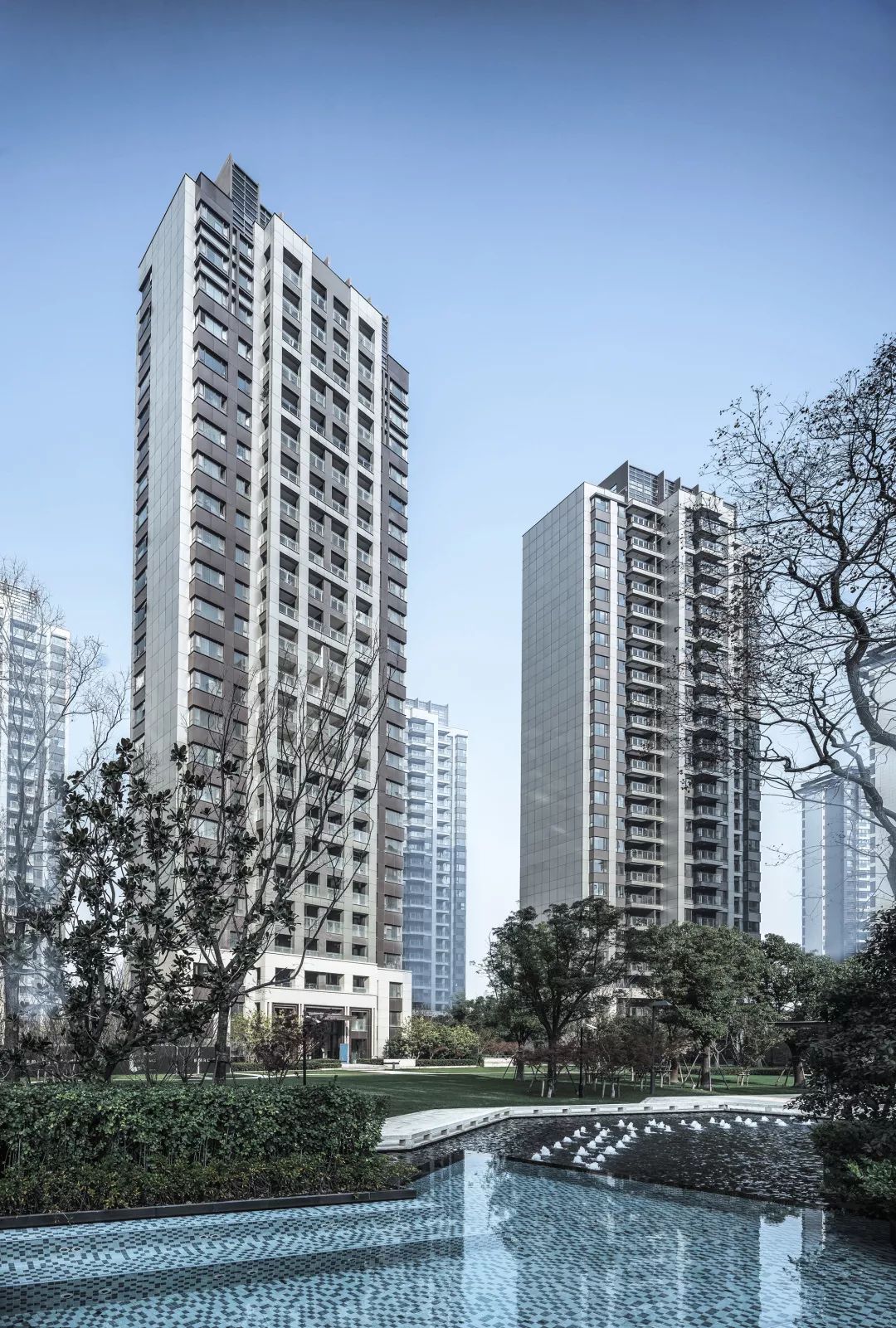 建筑以现代风格为骨架,含蓄结合古典风格的特点,结合建筑体量,以一种竖向展开的姿态展示出来。建筑造型沉着、典雅,强调整体的比例与细部的尺度。建筑形体的处理上,通过体量的进退获得大量阳台,阳台间通过构架设计体现建筑的整体性。观景方向的大面开窗,使视线开阔的同时也加强了建筑立面的虚实对比。