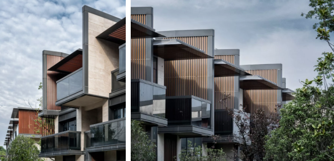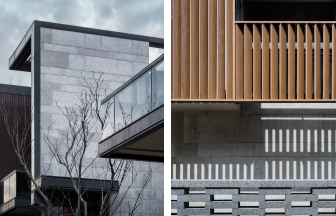材料选用上呼应古镇传统,融入现代风格特色,选用了石材及金属板。石材采用干挂做法,通过不同形式的分缝以及不同形式的石材表面处理组合,再搭配金属压边和百叶,巧工独匠,在立面上呈现出精致多样的效果,与精品商业的气质相融合。