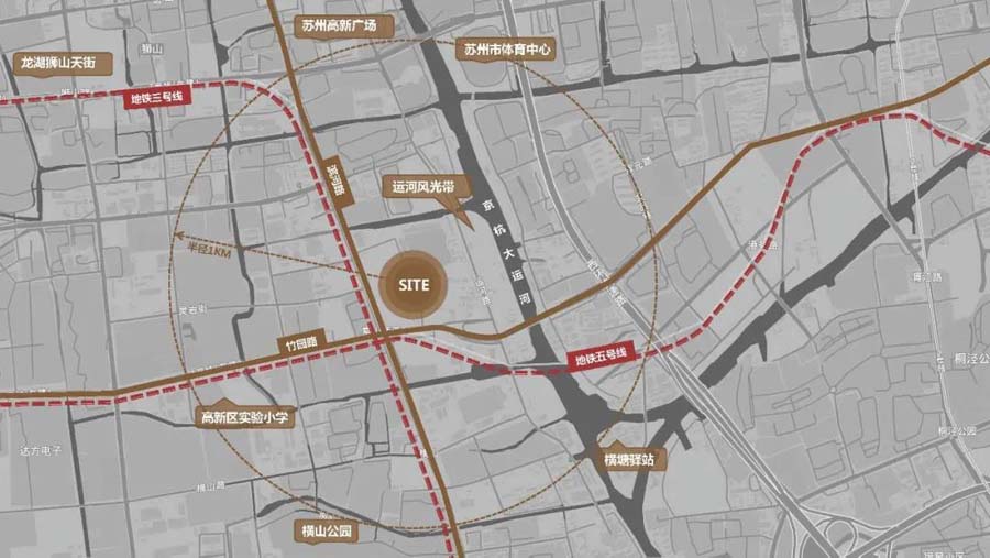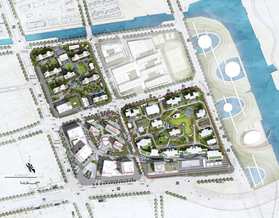 项目地处大运河沿岸城市设计范围内,东侧邻运河路,南侧邻竹园路。如何将具有金融属性的外滩文化融入到运河文化中,使整个项目更加灵动,也更富内涵,是本次设计的主要切入点。