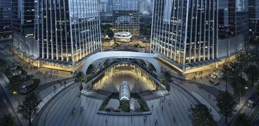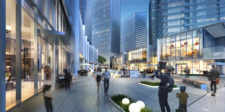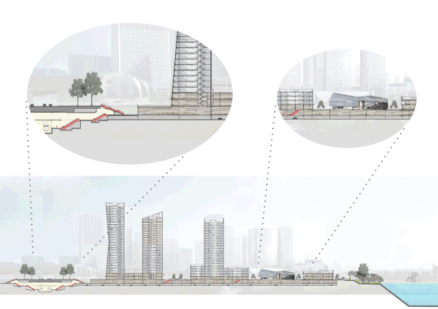 开阔的河岸景观,城市广场,公共绿地如同毛细血管确保能够深入每一个街区,自由畅通,营造各种人们美好生活的场景,同时可以在绿意盎然的街道跑步、聚会、遛狗等等。下沉式的商业,打造城市立体空间,满足城市精英生机勃勃的生活活动。