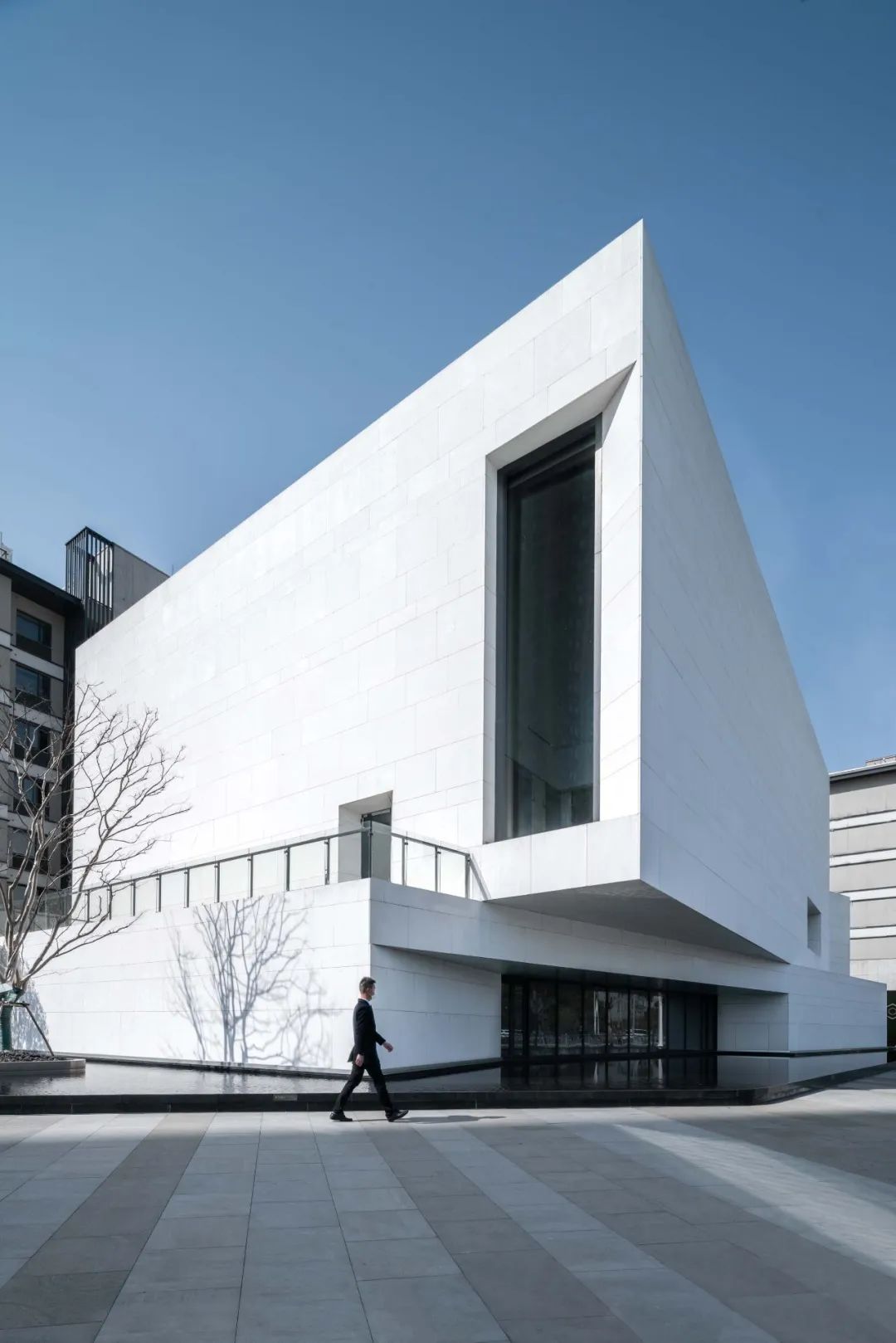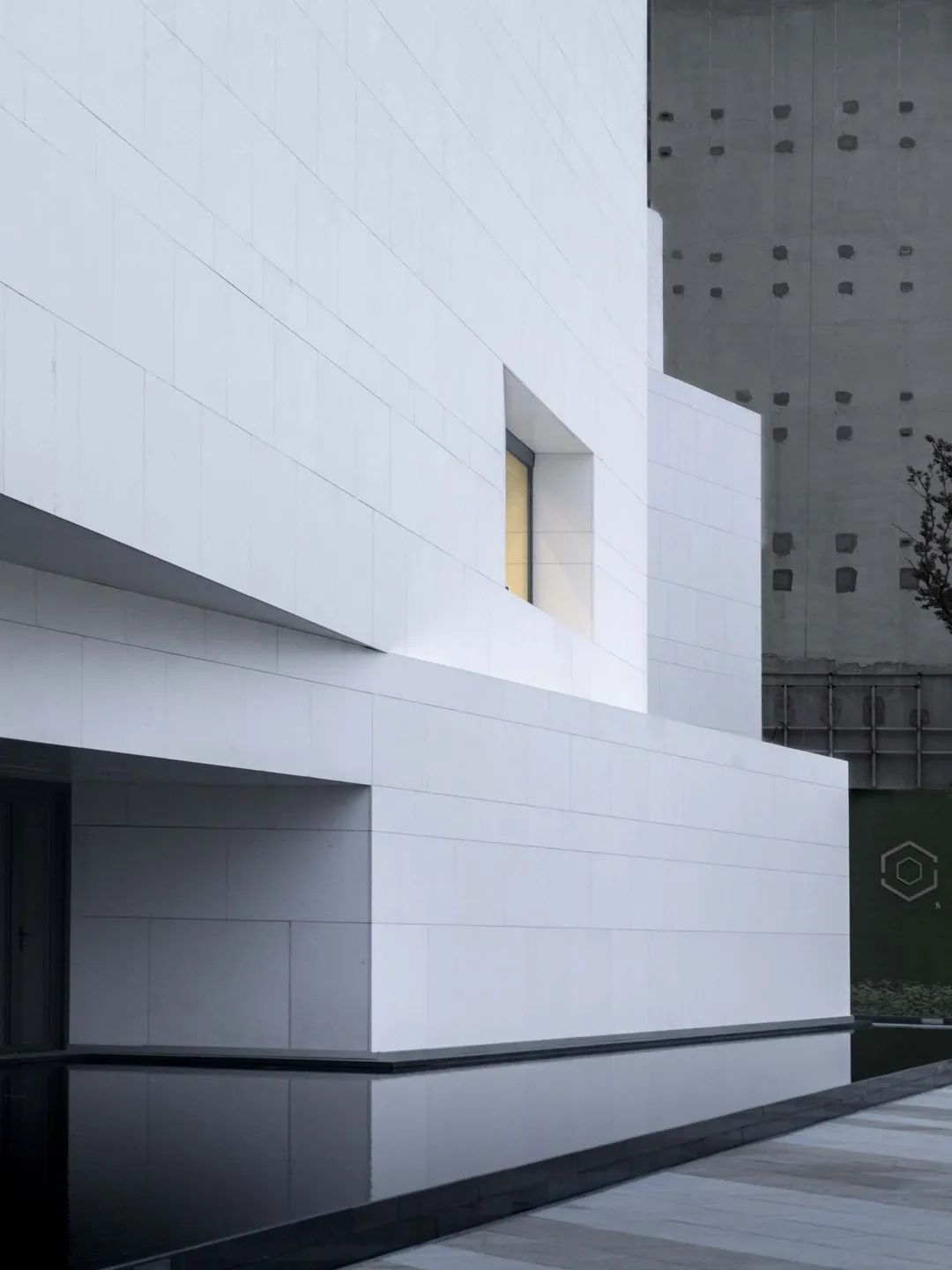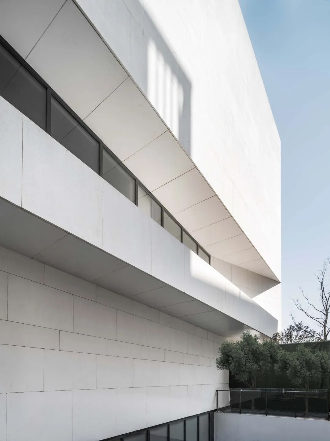 建筑主体选用更具质感的葡萄牙白色砂岩干挂而成,白砂干挂与玻璃的材质形成鲜明对比,在亦虚亦实间完成了对空间的诠释,带来了一种强力又安静的氛围,让整个建筑形成一个更纯粹的空间关系,能够感知人的情绪,存放身心的场所。
