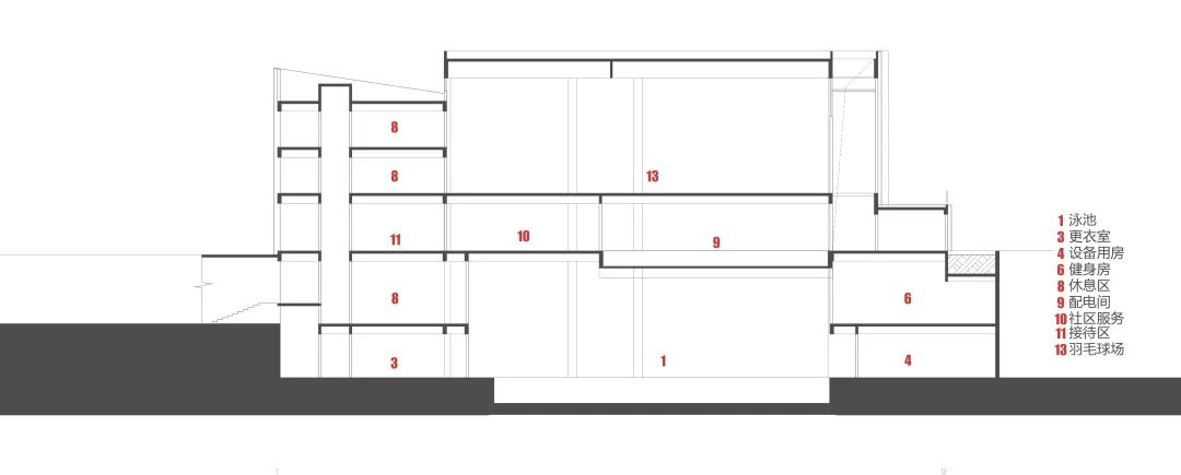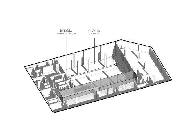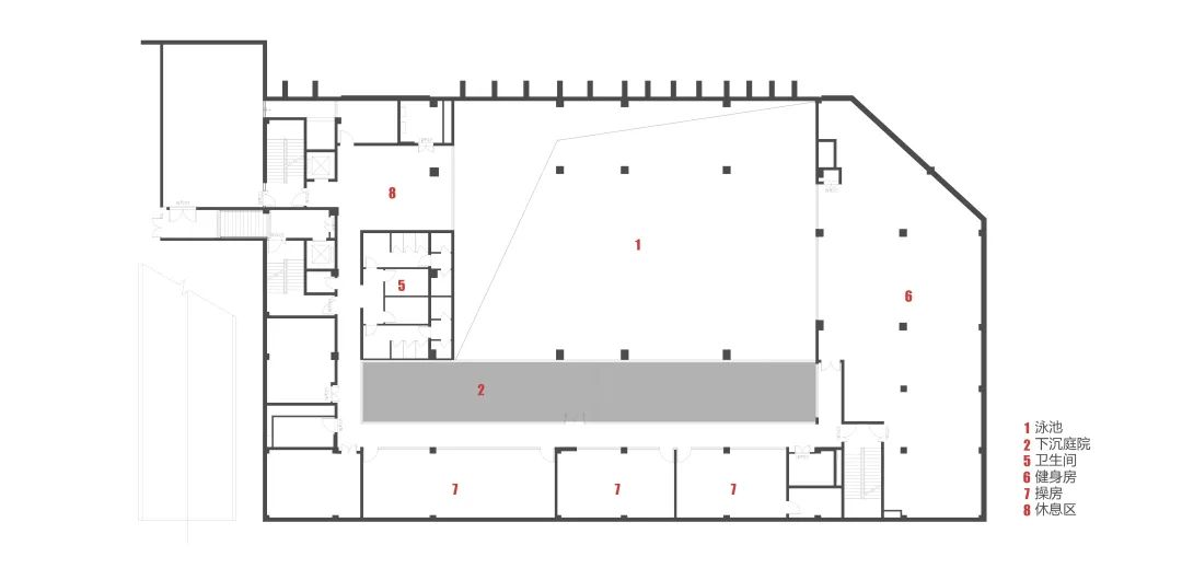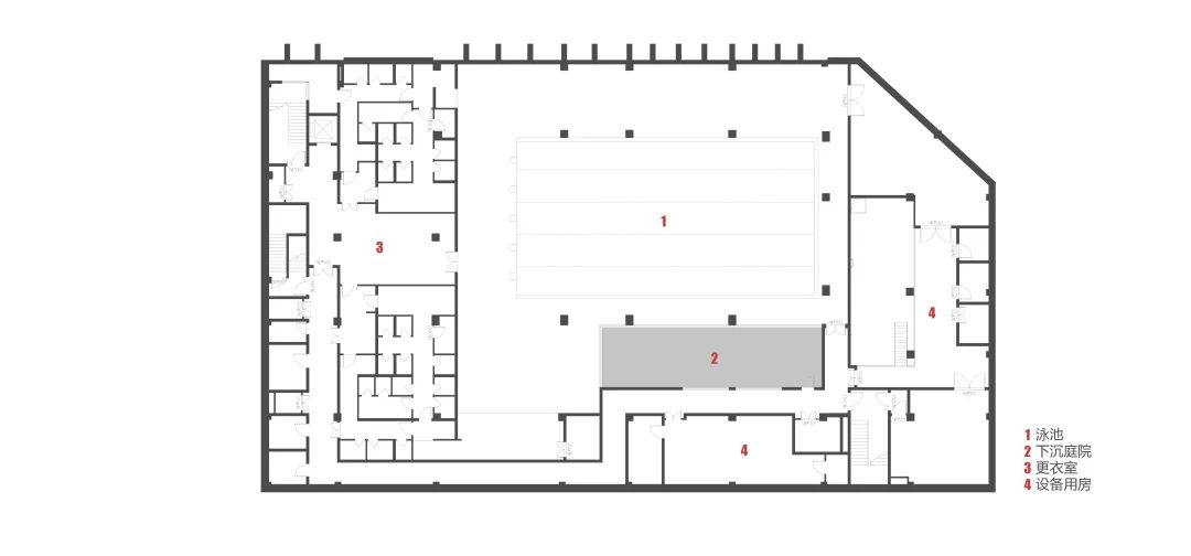 地下一、地下二层集合了泳池、休息、娱乐、健身等功能,围绕着一个采光庭院展开,利用侧高窗采光,也可以享受到不同品质的光线,这样的空间布置将形成虚和实,光线和风景的对话。