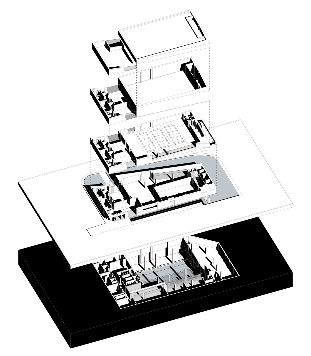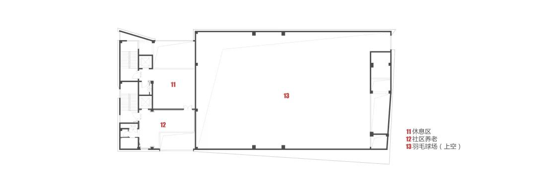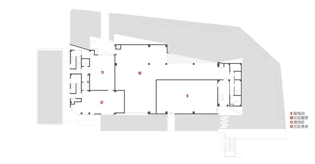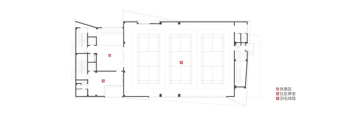 两个分离体量中间的“玻璃块”构成整个建筑的主入口,阳光从顶部透明玻璃采光顶照下来,这些原本在室外的元素被引入室内,模糊了室内外的边界,希望这个充满抽象出入口的建筑将人们的视线引导向内,人们在此休息、运动、交流、活动。