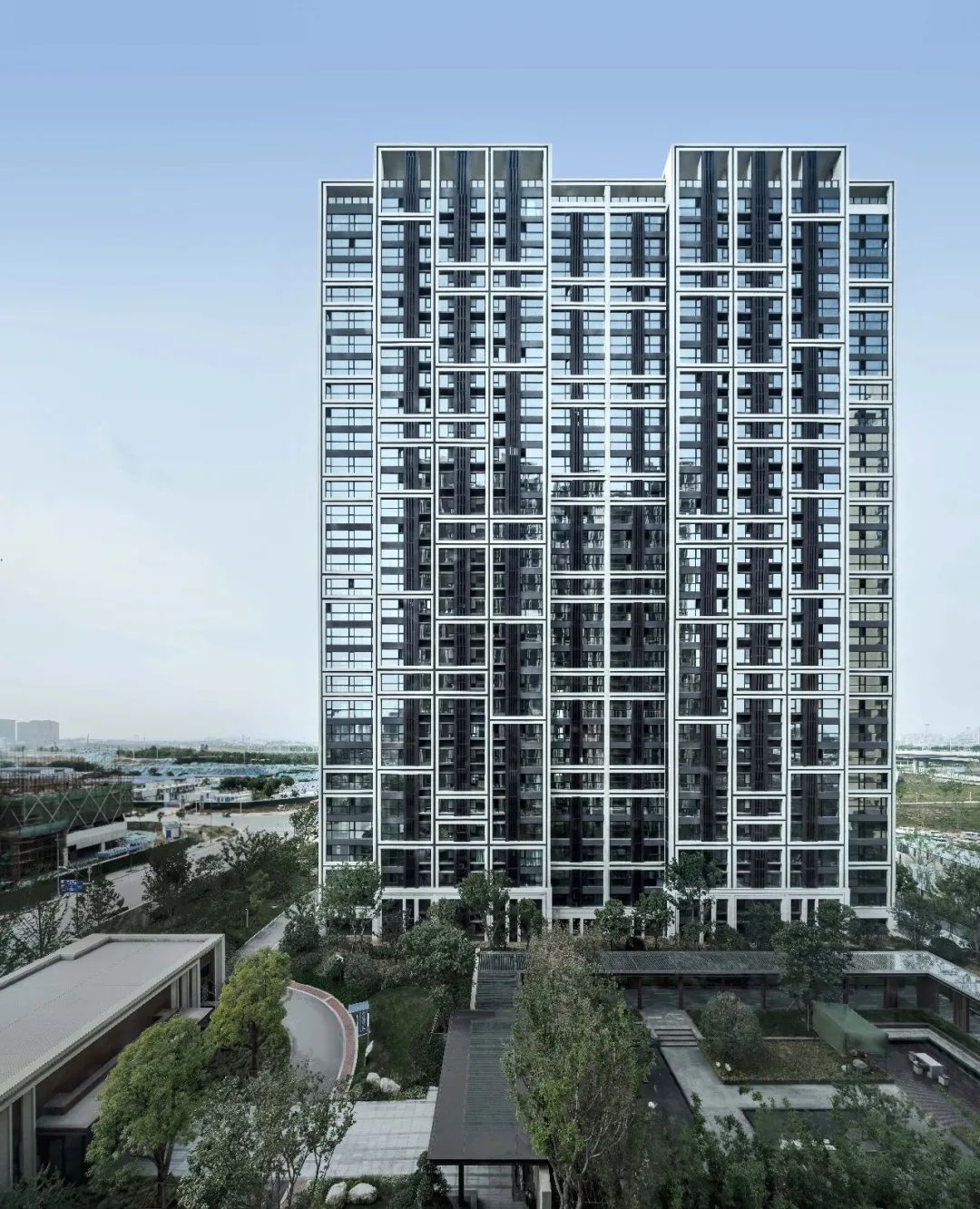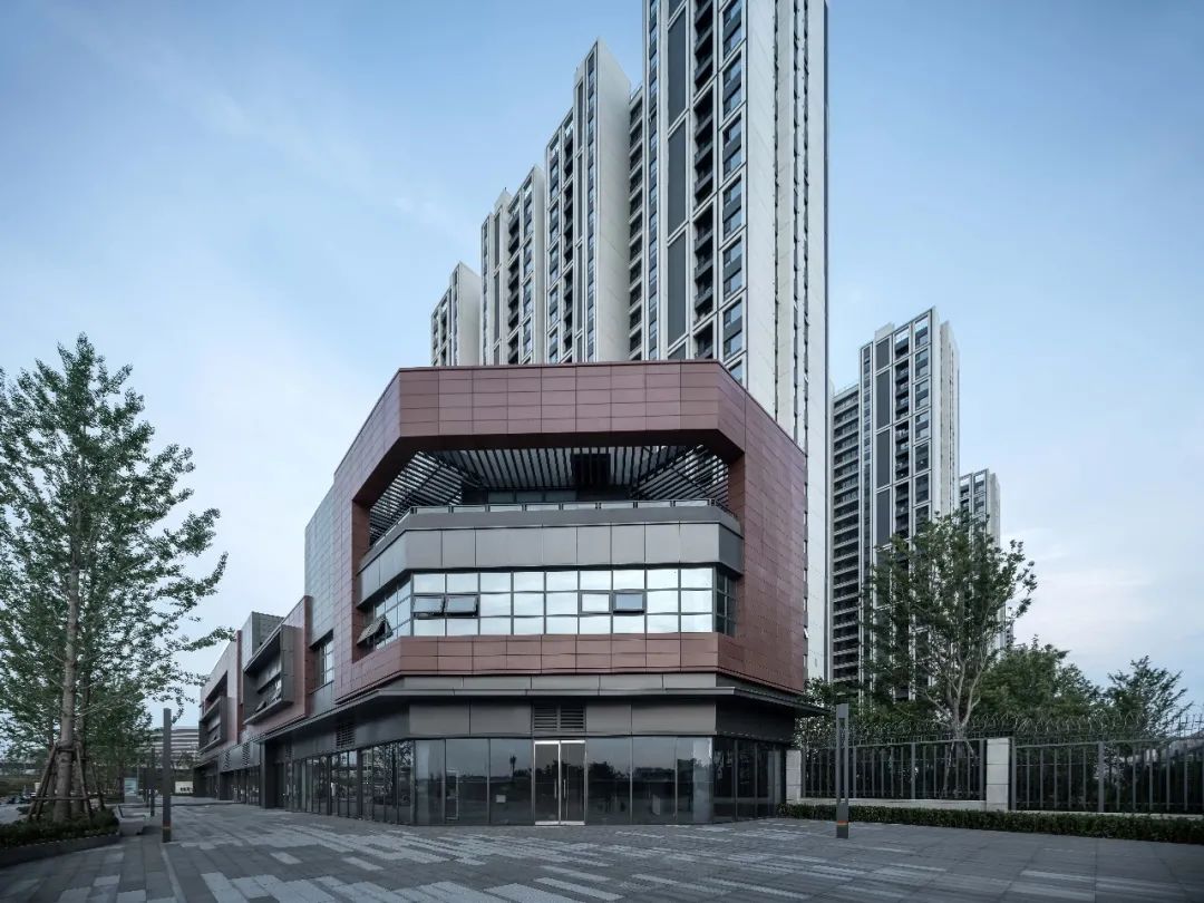 简约的立面构成体系,形成简洁挺拔的现代感,有机的格子错路肌理铺陈出活跃的美学界面,二者协调统一于一身。