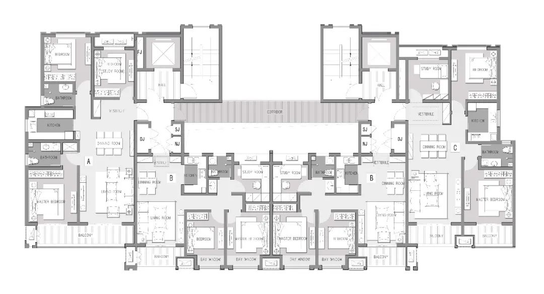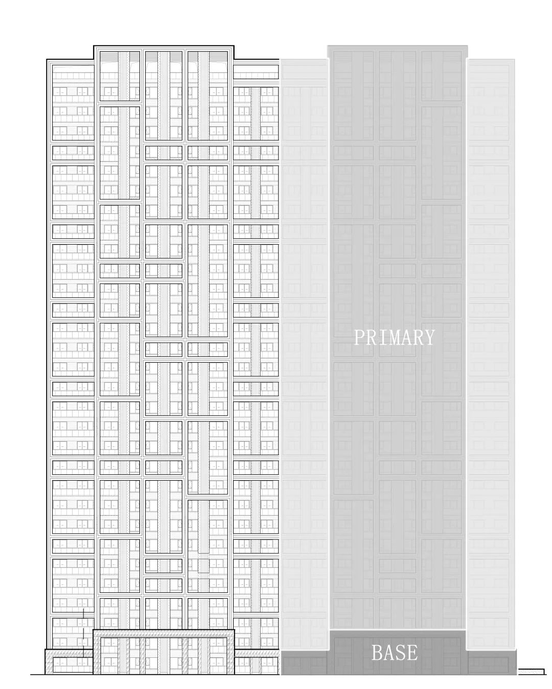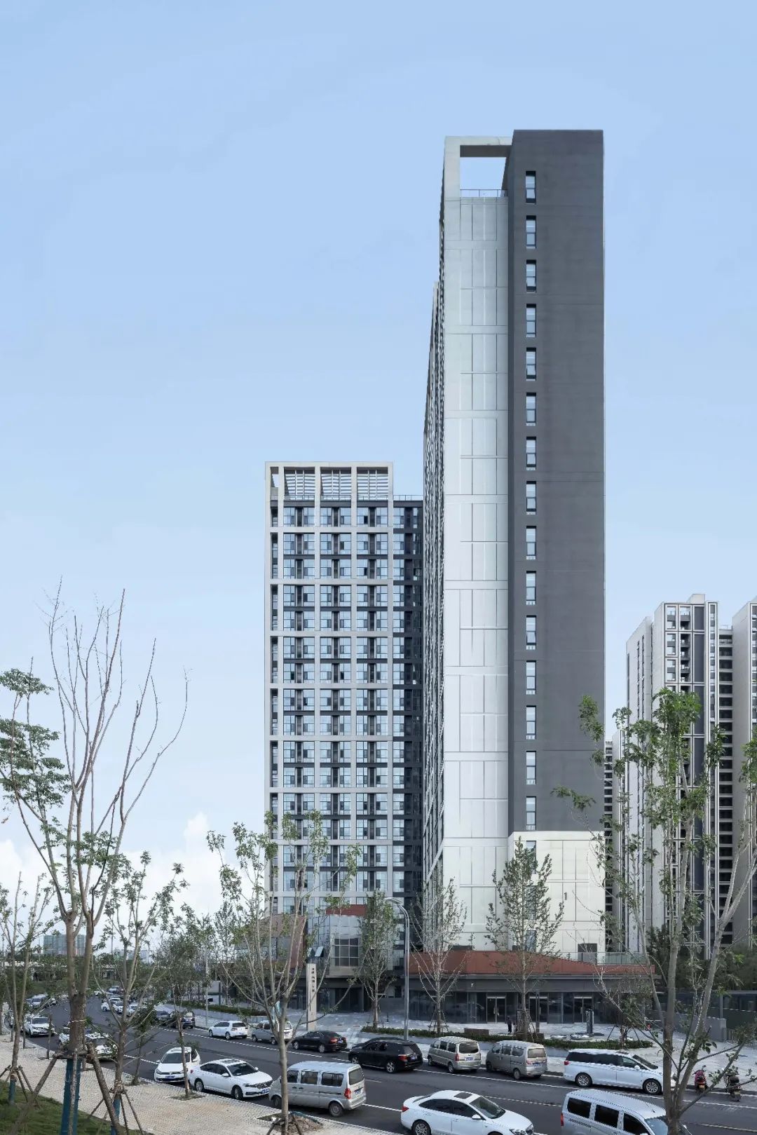 立面有意设计出框架感的层次,选用灰白色和深灰色的色彩加强了这种高级的序列感,非均性分隔又使立面远离厚重死板,走向活跃与生机。