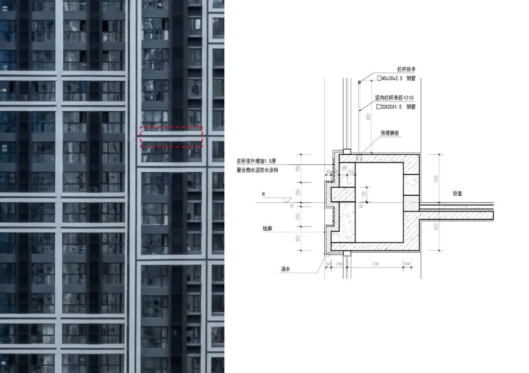 过硬朗的线条围合形成面 ,内部采用深色,与外框形成虚实对比,来增强建筑的张力。两侧的外框上下错动,使立面立面更富有设计感。